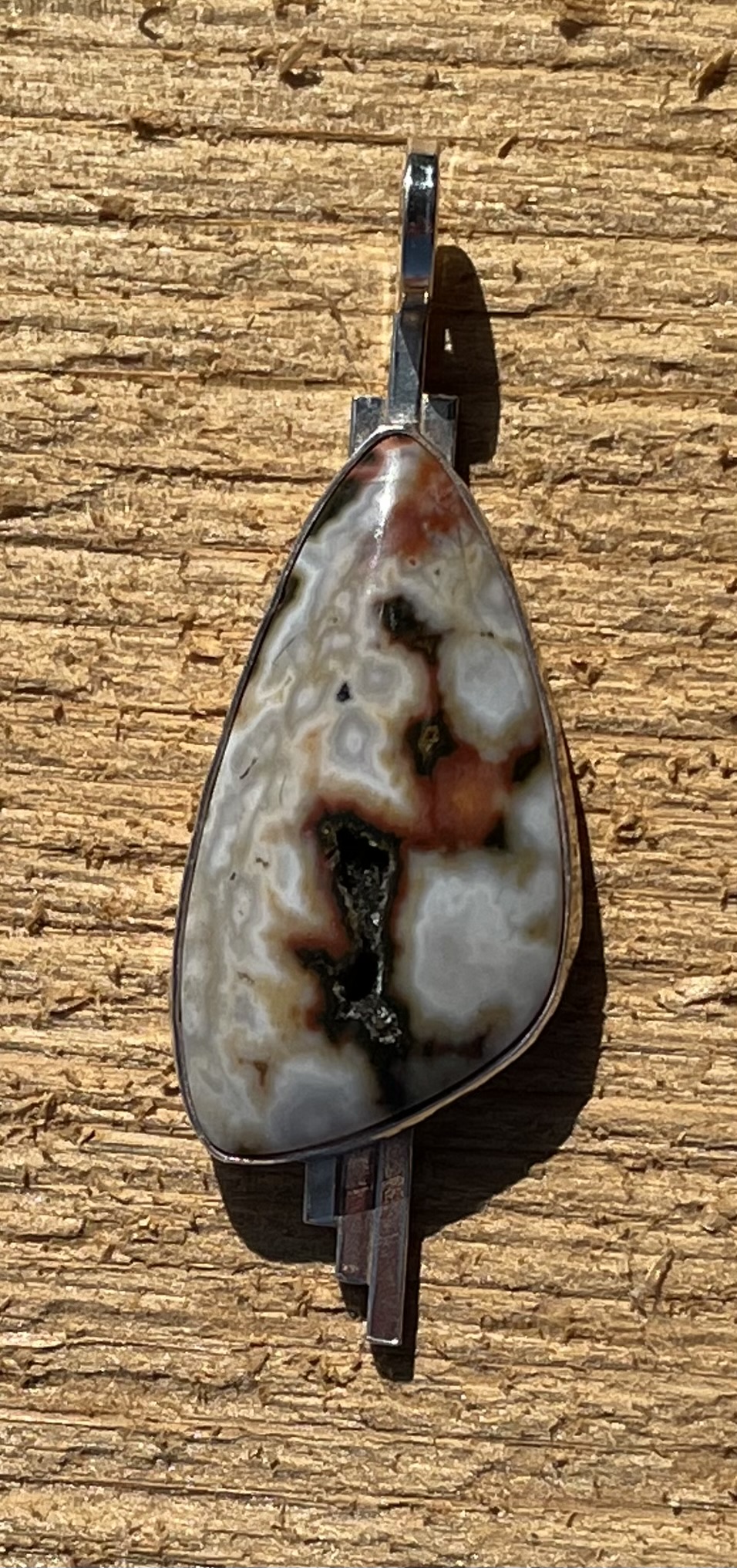 Ocean jasper gemstone with druzy inclusion set in sterling silver.