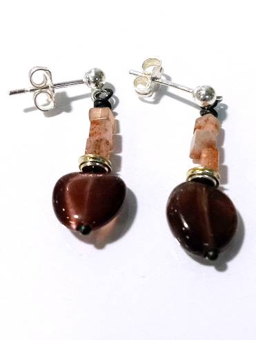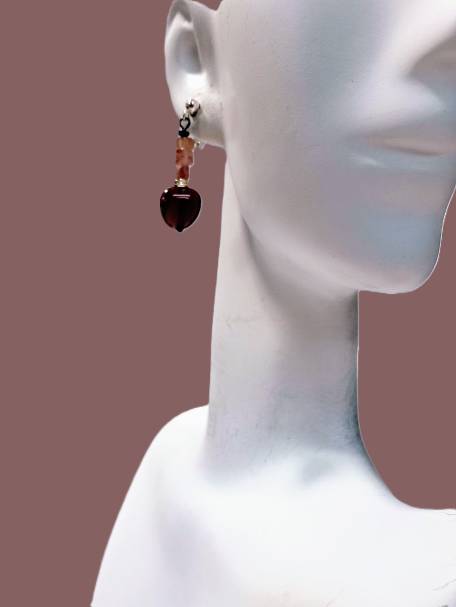 Sterling Silver Post Earrings with heart-shaped smooth Red Moonstone, topped with 3 rondel-shaped Sunstone beads.