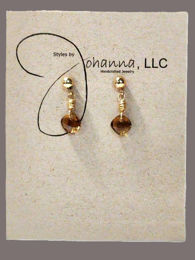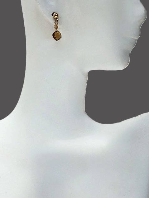 Gold fill Post Earrings with small flat faceted diamond-shaped Whiskey Quartz dangles.