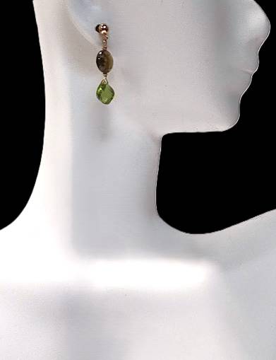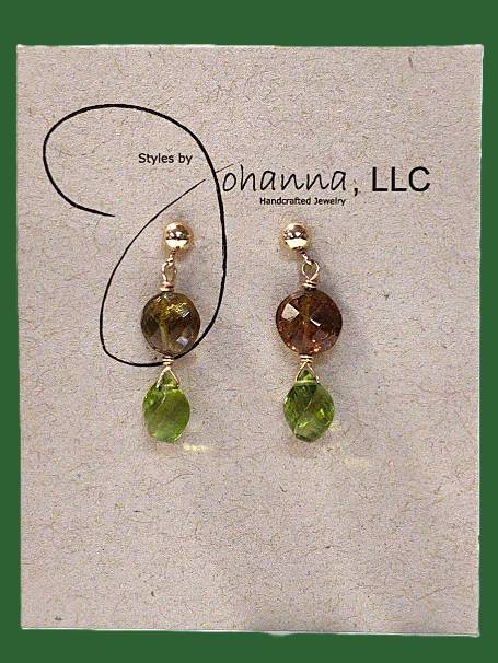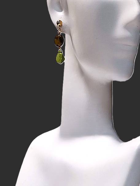 Gold fill Post Earrings with fancy twisted Peridot drops topped with flat round faceted Hessonite Garnet beads.