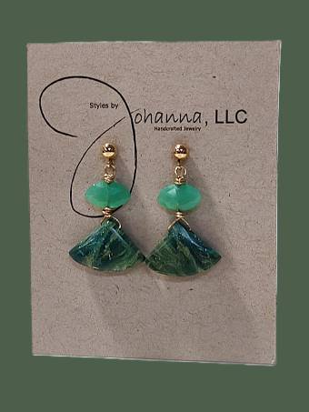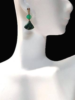 Gold fill Post Earrings with a smooth triangular Opalina bead topped with a sideways drilled faceted green Chalcedony bead on top.