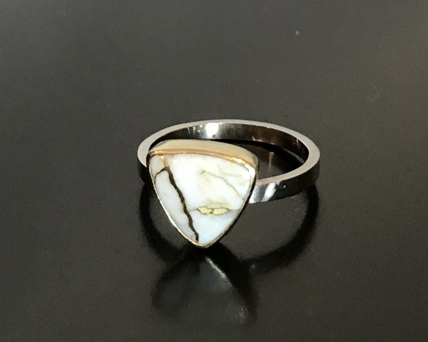 Man-made cabachon of natural white quartz infused with 18K gold. Ring is 14K gold. Size 6 1/2.