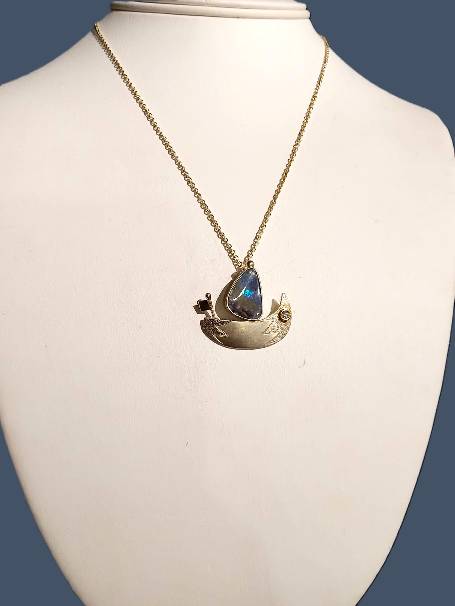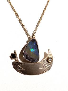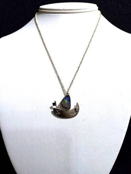 A beautiful & stunning handcrafted STERLING SILVER- 14KY, BOULDER OPAL & .04ct DIAMOND SAILBOAT NECKLACE created by the talented local Jeweler & Metalsmith John Hasseler.