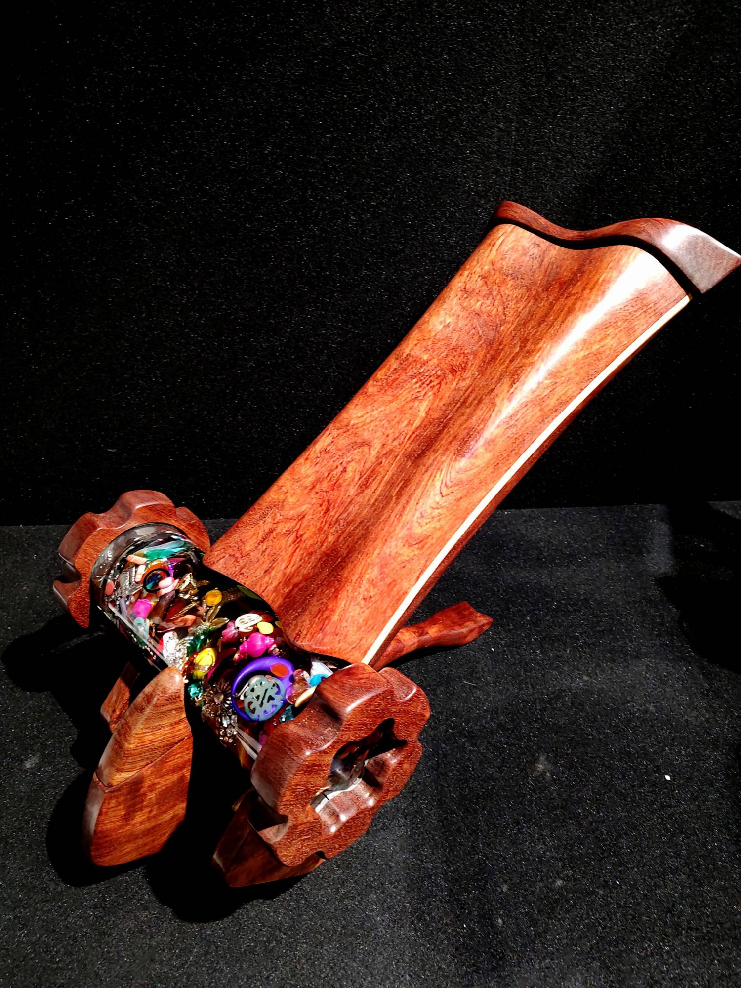 The HONEY TIME kaleidoscope by Henry Bergeson. The Honey Time kaleidoscope is the latest of the large kaleidoscopes. Like the Honey jar that came before it ,It is a large pedestal scope that features a mirror system that is large enough to view with both eyes. This gives the viewer a three dimensional experience , which  is quite magical . In addition the cell is able to slide left to right providing an endless journey of visual delight. the scope itself is constructed from assorted exotic hardwoods, usually bubinga and African teak .