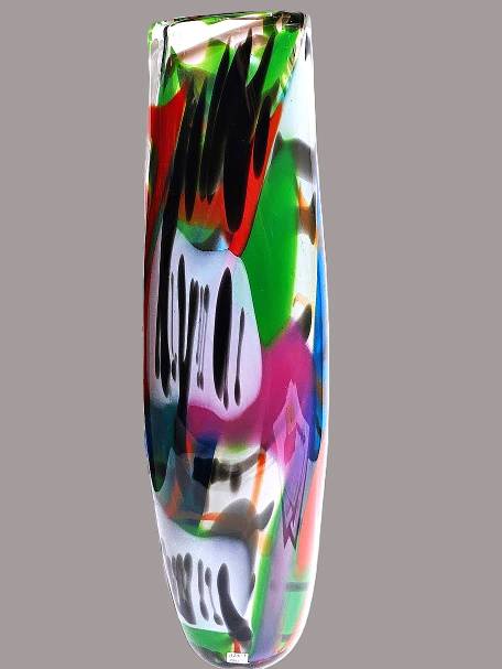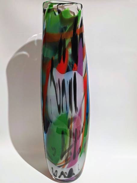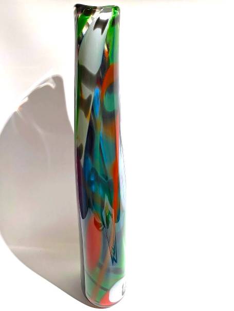 A MULTICOLORED BLACK STRIPED TALL VASE- handcrafted by local Glassblower Robinson Scott, from Anoka, Minnesota. He has been blowing glass for over 45 years. His stunning artwork has earned him many awards through his glassblowing career. “I am always influenced by the importance of simplistic designs that enhance and accentuate the depth, reflectivity and translucency that naturally occur in glass. The predictability and unpredictability of glass creates an atmosphere of discovery, learning and continual growth. This is what motivates me to further test, expand and explore my abilities.”- Robinson Scott.