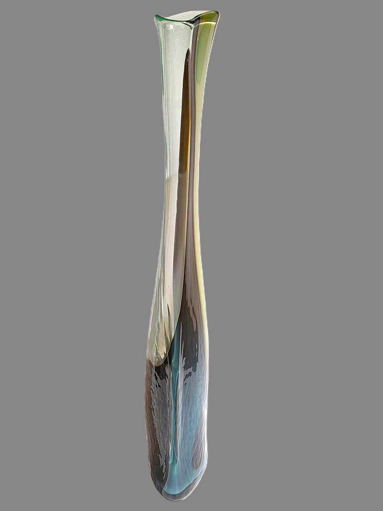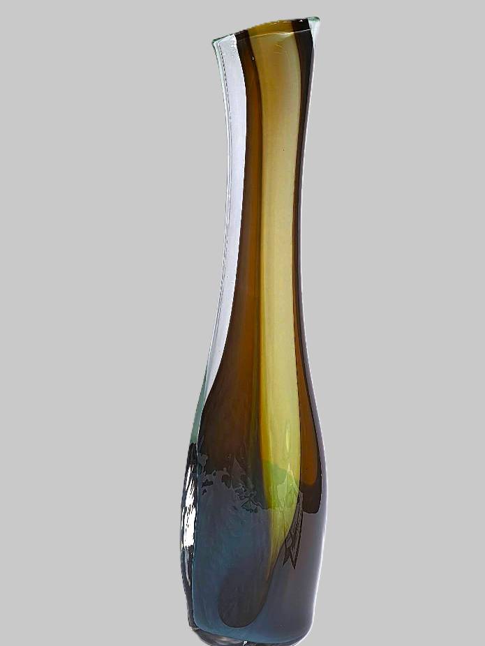 AN AMBER AND LIGHT GREEN TWO SIDED TALL VASE- handcrafted by local Glassblower Robinson Scott, from Anoka, Minnesota. He has been blowing glass for over 45 years. His stunning artwork has earned him many awards through his glassblowing career. “I am always influenced by the importance of simplistic designs that enhance and accentuate the depth, reflectivity and translucency that naturally occur in glass. The predictability and unpredictability of glass creates an atmosphere of discovery, learning and continual growth. This is what motivates me to further test, expand and explore my abilities.”- Robinson Scott.