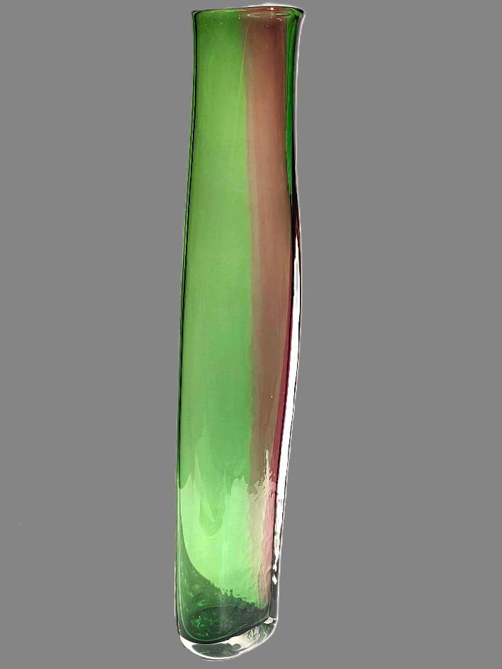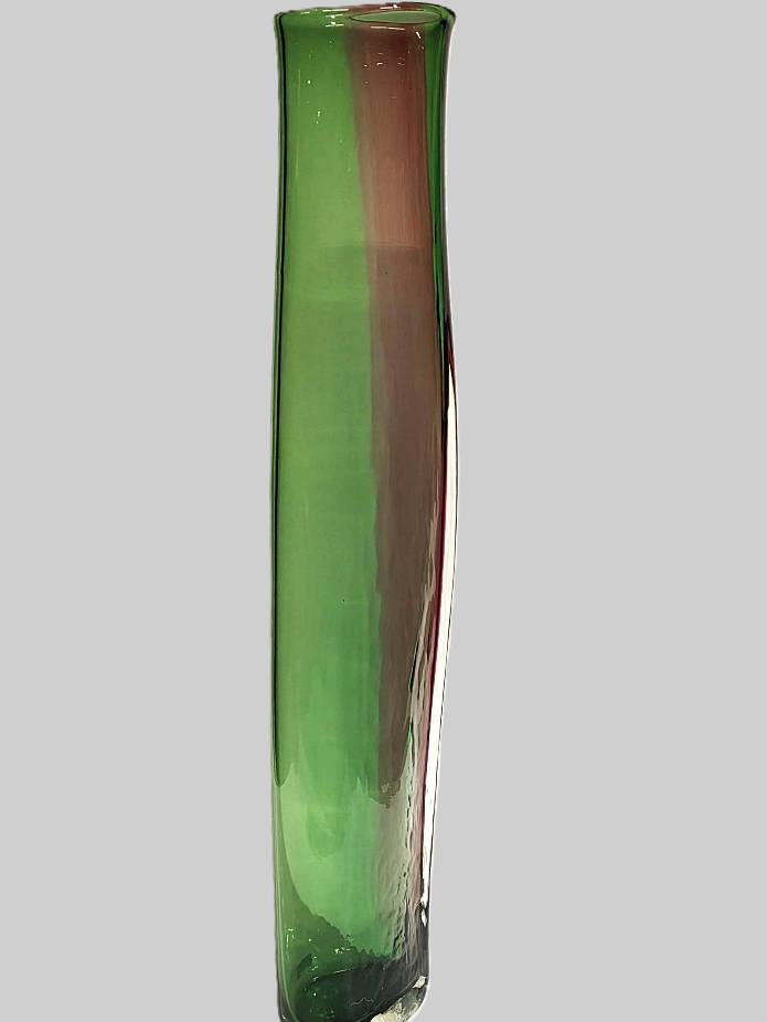 A GREEN AND RUBY TWO SIDED VASE- handcrafted by local Glassblower Robinson Scott, from Anoka, Minnesota. He has been blowing glass for over 45 years. His stunning artwork has earned him many awards through his glassblowing career. “I am always influenced by the importance of simplistic designs that enhance and accentuate the depth, reflectivity and translucency that naturally occur in glass. The predictability and unpredictability of glass creates an atmosphere of discovery, learning and continual growth. This is what motivates me to further test, expand and explore my abilities.”- Robinson Scott.