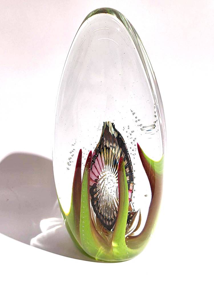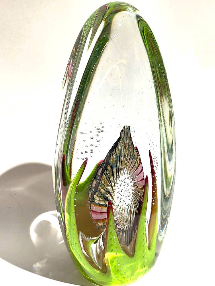 A LIGHT GREEN, RUBY AND WHITE SEASCAPE- handcrafted by local Glassblower Robinson Scott, from Anoka, Minnesota. He has been blowing glass for over 45 years. His stunning artwork has earned him many awards through his glassblowing career. “I am always influenced by the importance of simplistic designs that enhance and accentuate the depth, reflectivity and translucency that naturally occur in glass. The predictability and unpredictability of glass creates an atmosphere of discovery, learning and continual growth. This is what motivates me to further test, expand and explore my abilities.”- Robinson Scott.