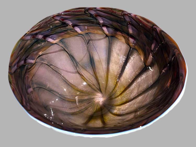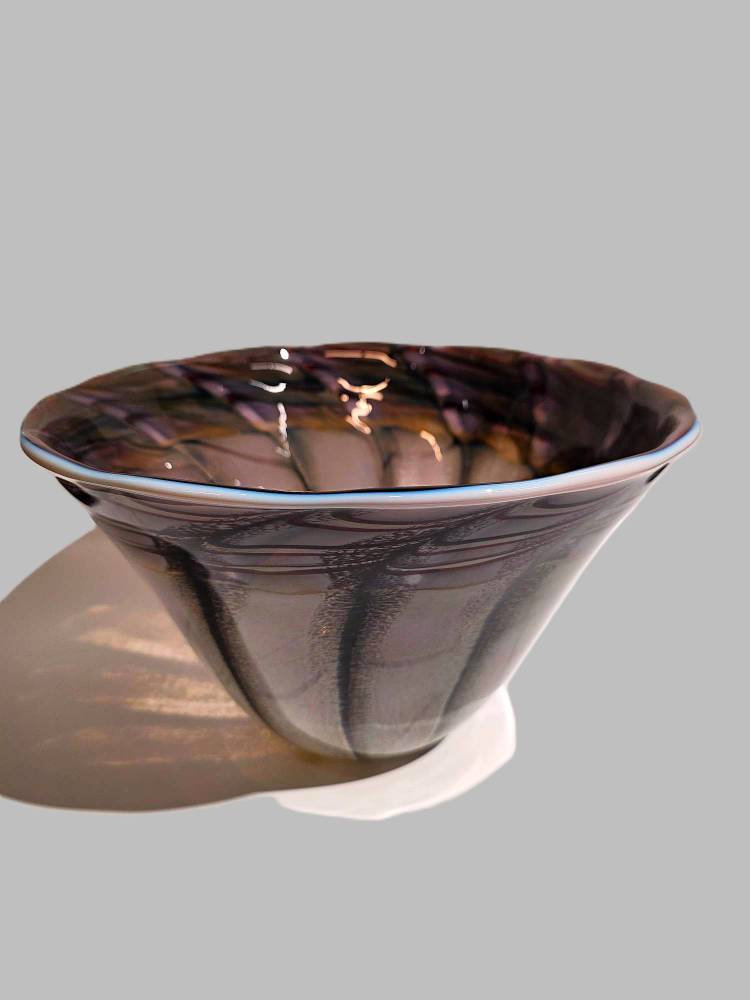 A PURPLE, WHIITE AND GREEN BUTTERFLY PATTERN BOWL- handcrafted by local Glassblower Robinson Scott, from Anoka, Minnesota. He has been blowing glass for over 45 years. His stunning artwork has earned him many awards through his glassblowing career. “I am always influenced by the importance of simplistic designs that enhance and accentuate the depth, reflectivity and translucency that naturally occur in glass. The predictability and unpredictability of glass creates an atmosphere of discovery, learning and continual growth. This is what motivates me to further test, expand and explore my abilities.”- Robinson Scott.