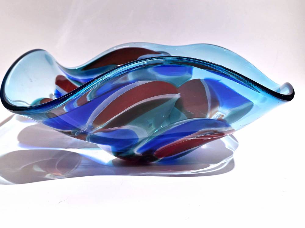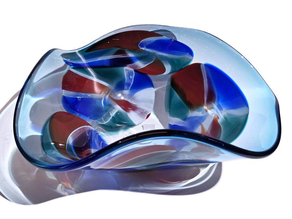 A BLUE, RED, AND GREEN COLOR COOKIE WAVY BOWL- handcrafted by local Glassblower Robinson Scott, from Anoka, Minnesota. He has been blowing glass for over 45 years. His stunning artwork has earned him many awards through his glassblowing career. “I am always influenced by the importance of simplistic designs that enhance and accentuate the depth, reflectivity and translucency that naturally occur in glass. The predictability and unpredictability of glass creates an atmosphere of discovery, learning and continual growth. This is what motivates me to further test, expand and explore my abilities.”- Robinson Scott.