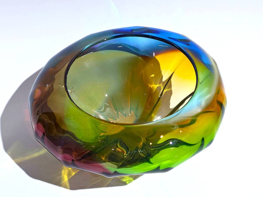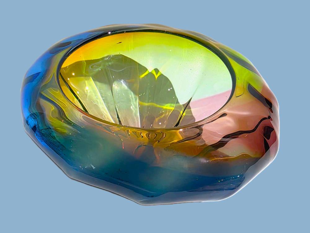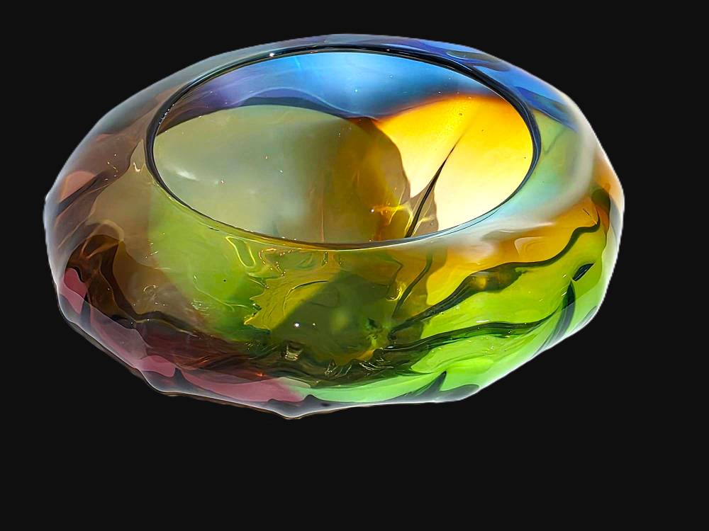 A BLUE, GREEN AND PURPLE MINI OPTIC BOWL- handcrafted by local Glassblower Robinson Scott, from Anoka, Minnesota.  He has been blowing glass for over 45 years. His stunning artwork has earned him many awards through his glassblowing career. “I am always influenced by the importance of simplistic designs that enhance and accentuate the depth, reflectivity and translucency that naturally occur in glass. The predictability and unpredictability of glass creates an atmosphere of discovery, learning and continual growth. This is what motivates me to further test, expand and explore my abilities.”- Robinson Scott.