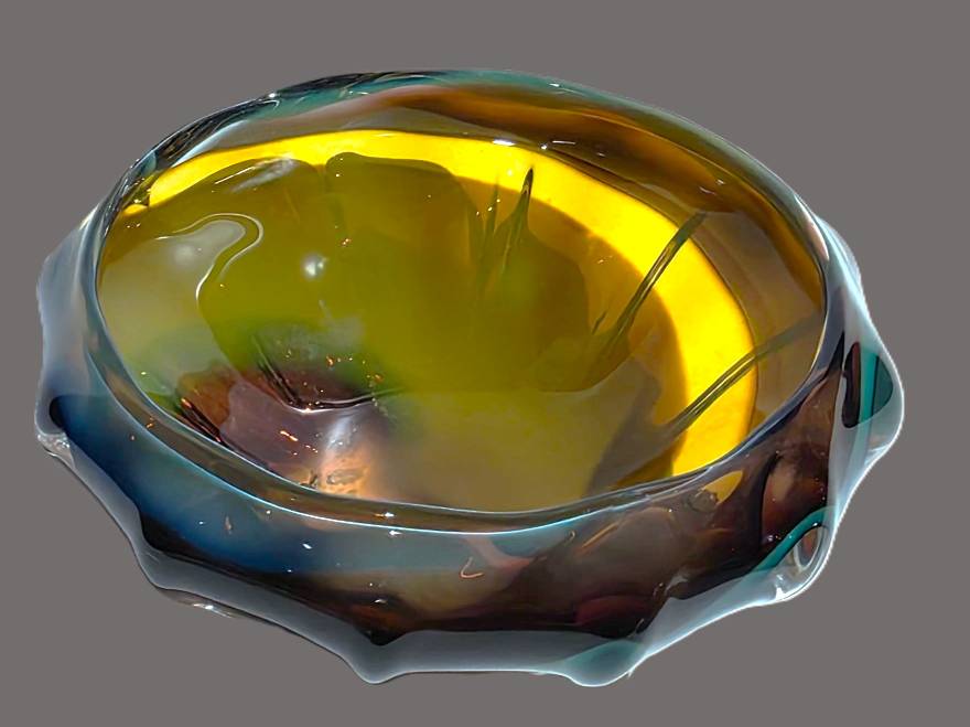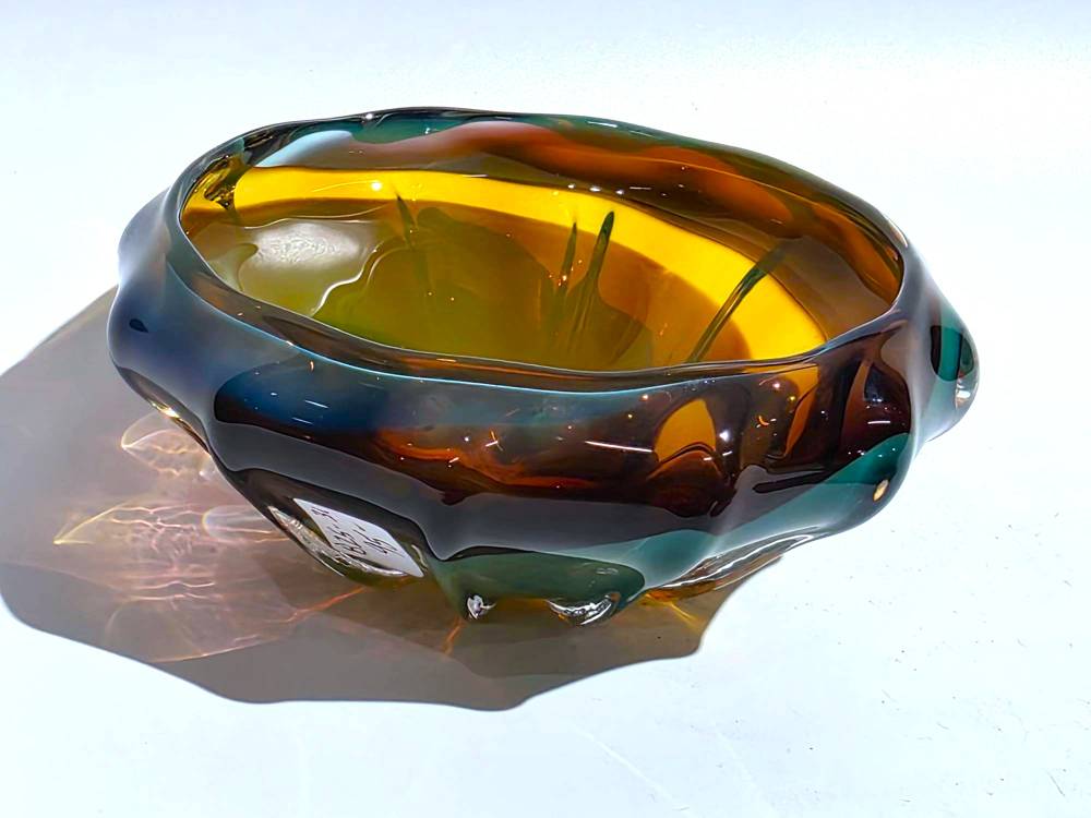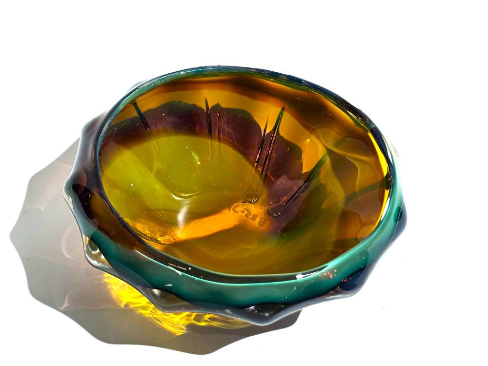 An Amber, Blue, and Green MINI OPTIC BOWL- handcrafted by local Glassblower Robinson Scott, from Anoka, Minnesota.  He has been blowing glass for over 45 years. His stunning artwork has earned him many awards through his glassblowing career. “I am always influenced by the importance of simplistic designs that enhance and accentuate the depth, reflectivity and translucency that naturally occur in glass. The predictability and unpredictability of glass creates an atmosphere of discovery, learning and continual growth. This is what motivates me to further test, expand and explore my abilities.”- Robinson Scott.