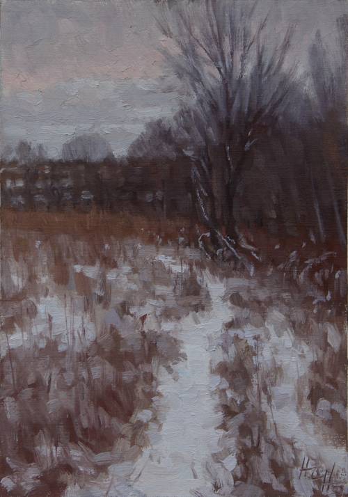 "I am a self-taught artist living and working in rural southeastern Minnesota. Working in oils and watercolor, my work is a study of place, time, and season. I love the place where I live; as familiar as the back of my hand, yet never the same two days in a row. I draw a lot of inspiration from my local area. I enjoy the challenge of plein air painting, and the way it encourages taking a closer look, to more fully take in what might otherwise go unnoticed. My plein air paintings, done outdoors on location, usually within 2 to 3 hours, attempt to capture the fleeting and changing view of a particular place and time as I see it. My studio works, supported by plein air studies, memories, emotion, and imagination, are built up through a lot of time and layers of paint and allow me to work in more detail. In all my work, I try to capture the beauty I see in the simple, everyday blessings, in faces and events, subtle and breathtaking, convinced that, "Every good gift and every perfect gift is from above, and comes down from the Father of lights, with whom there is no variation or shadow of turning." (James 1:17)" -- Hannah Heyer