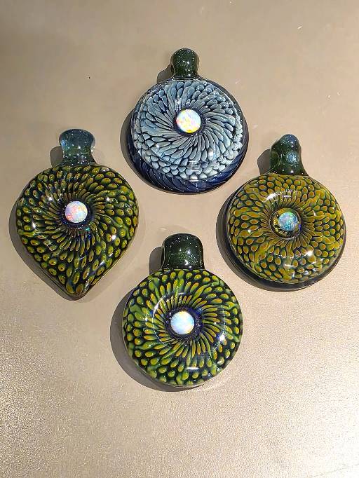A SNAKESKIN OPAL MEDALLION PENDANT from Rochester Glass Artist Seth Auger from FireKist Glass. Each is different from the other, each is handcrafted not to be duplicated. Seth Auger has been a glass artist for 20 years. He fell in love with the process of melting glass to create art while in college. His work in our gallery include vases, marbles & ornaments, jewelry and bells.