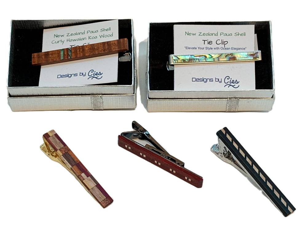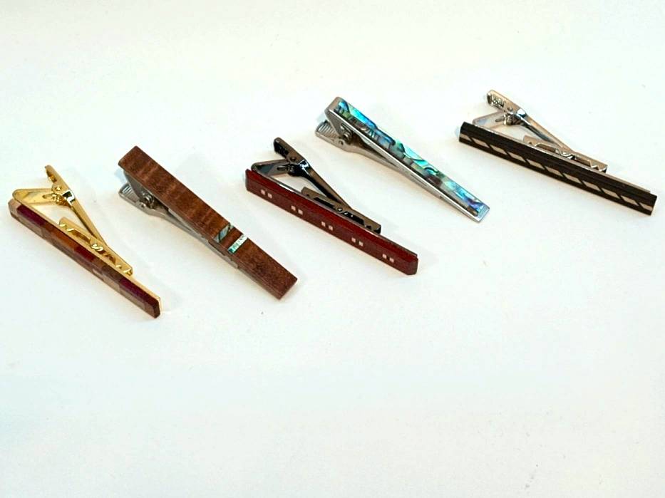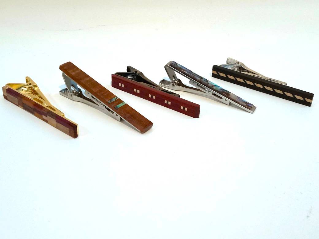 A TIE CLIP- Hand crafted by Rochester, MN artist Bob Cieslack, made from stainless steel and covered in domestic and exotic woods from around the world. Each different in the combination of woods used. Wooden Money Clip with abalone also available.