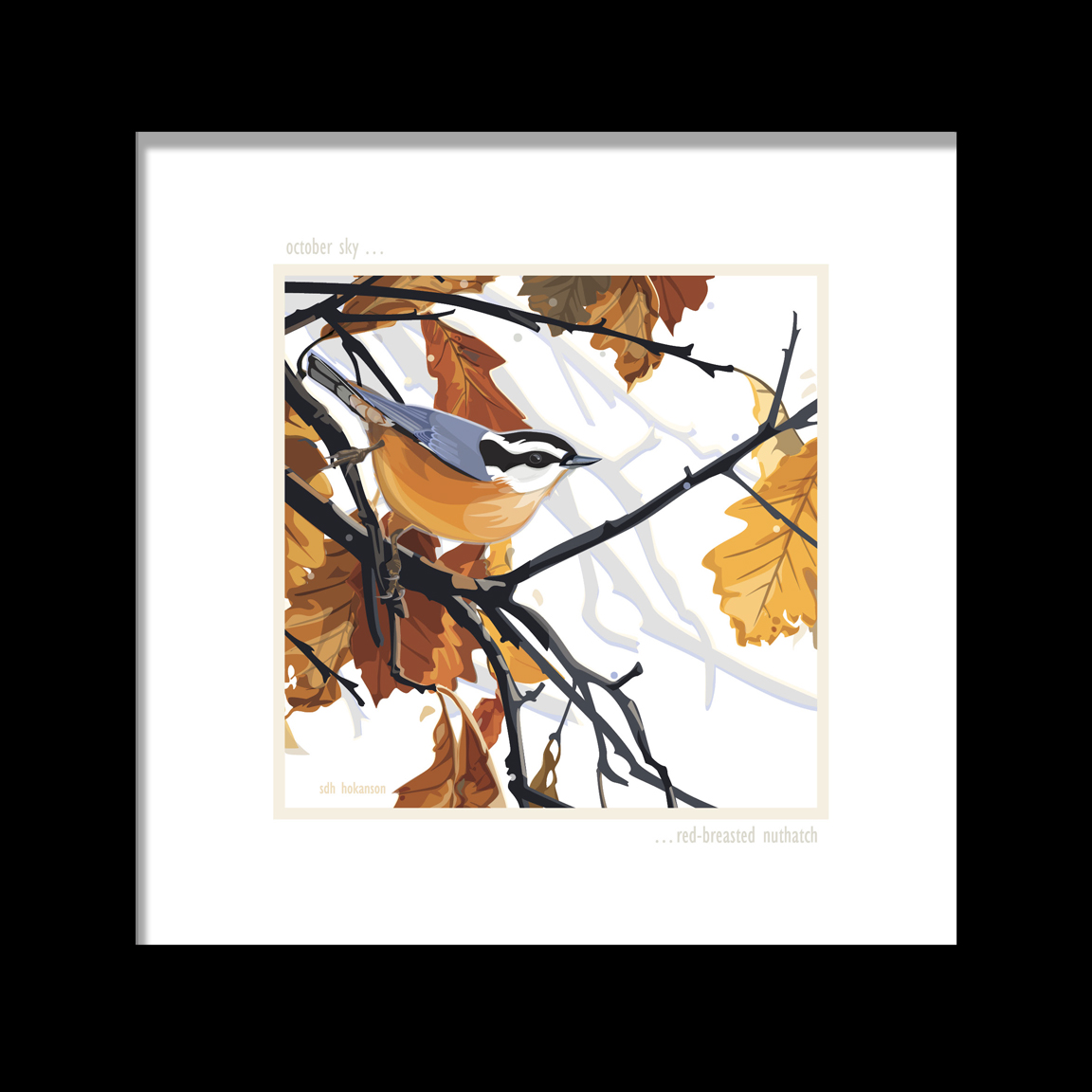 In this original illustration titled "October Sky - Red-breasted Nuthatch" by Sandy Hokanson, a brightly colored Red-breasted Nuthatch looks out from his perch among crisp autumn oak leaves. The sky is white with sparkles in the air. He looks ready to fly - is snow on the way? This image is available as a note card (blank inside), a signed 12" x 12" shrink-wrapped print, a framed print (black frame) or a 16" x 16" signed metal print.