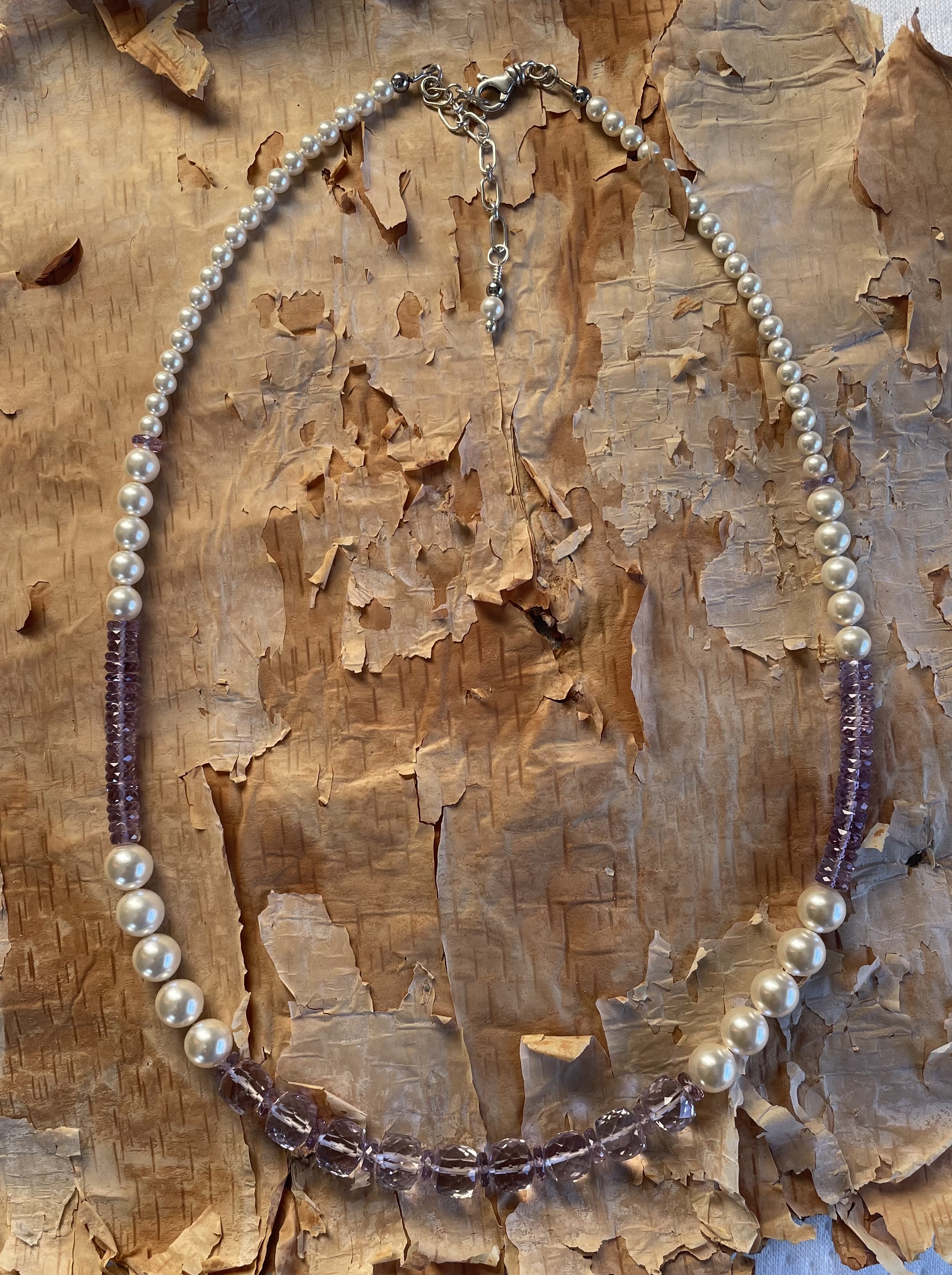 Faceted amethyst cubes and rondelles and Swarovski pearls sizes 4, 6 and 8 mm. Sterling silver chain and clasp.