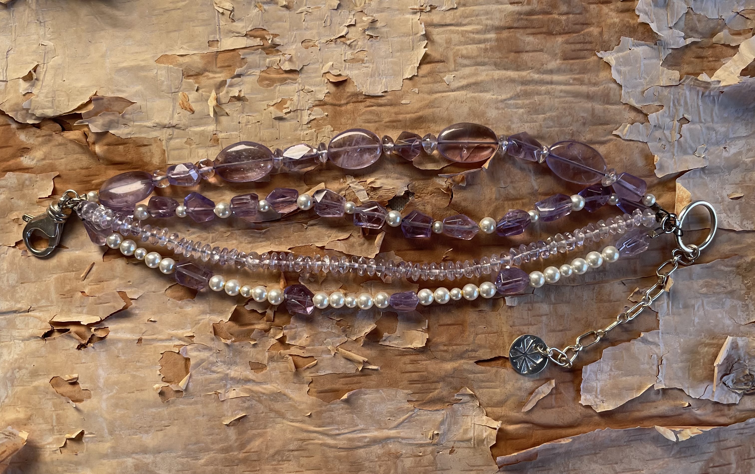 Various shaped amethyst beads, some faceted some smooth. Swarovski pearls 4 and 3 mm in size. Sterling silver chain, lobster clasp, crimps, rings and medallion.