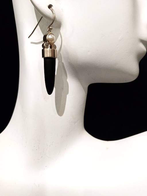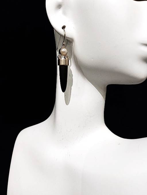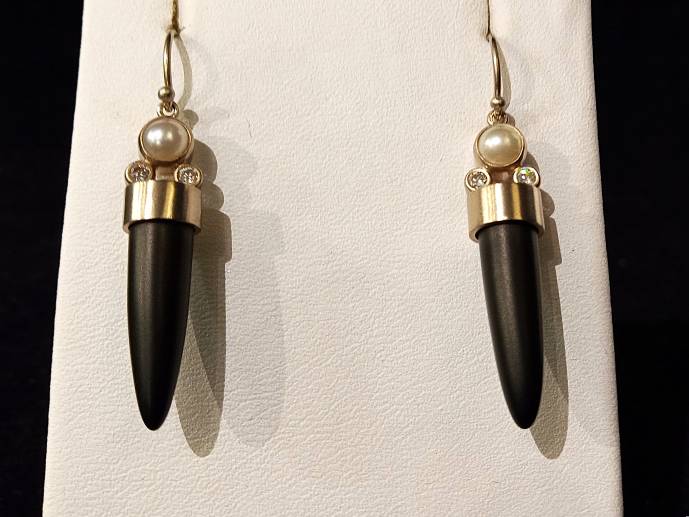 A beautiful & stunning handcrafted 14k White Bullet Shaped Black Onyx, Pearl & 4-.20ct Diamond Earrings created by the talented local Jeweler & Metalsmith John Hasseler.