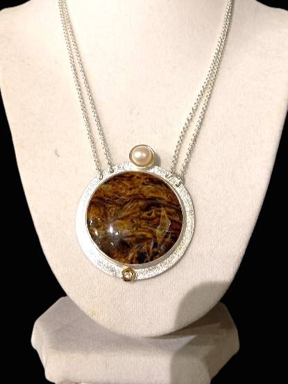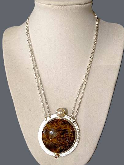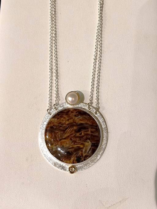A beautiful & stunning handcrafted Sterling Silver & 14K Yellow "Jupiter" Peitersite, Pearl & .05ct Diamond Necklace created by the talented local Jeweler & Metalsmith John Hasseler.