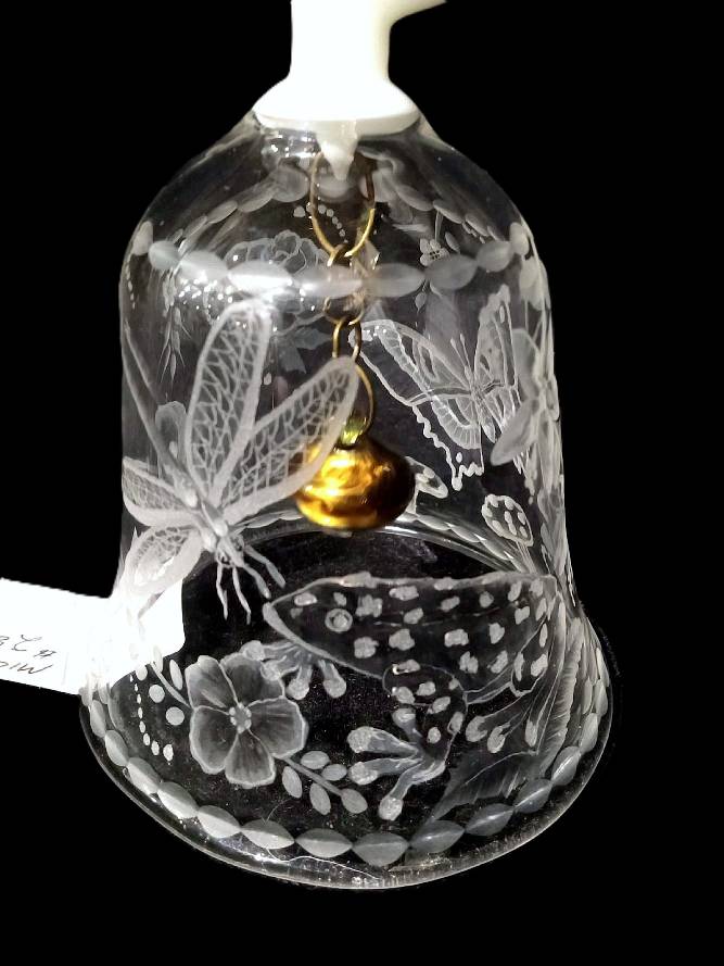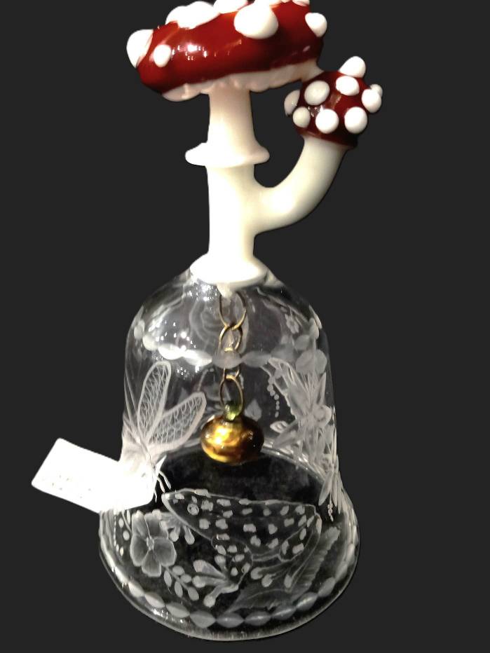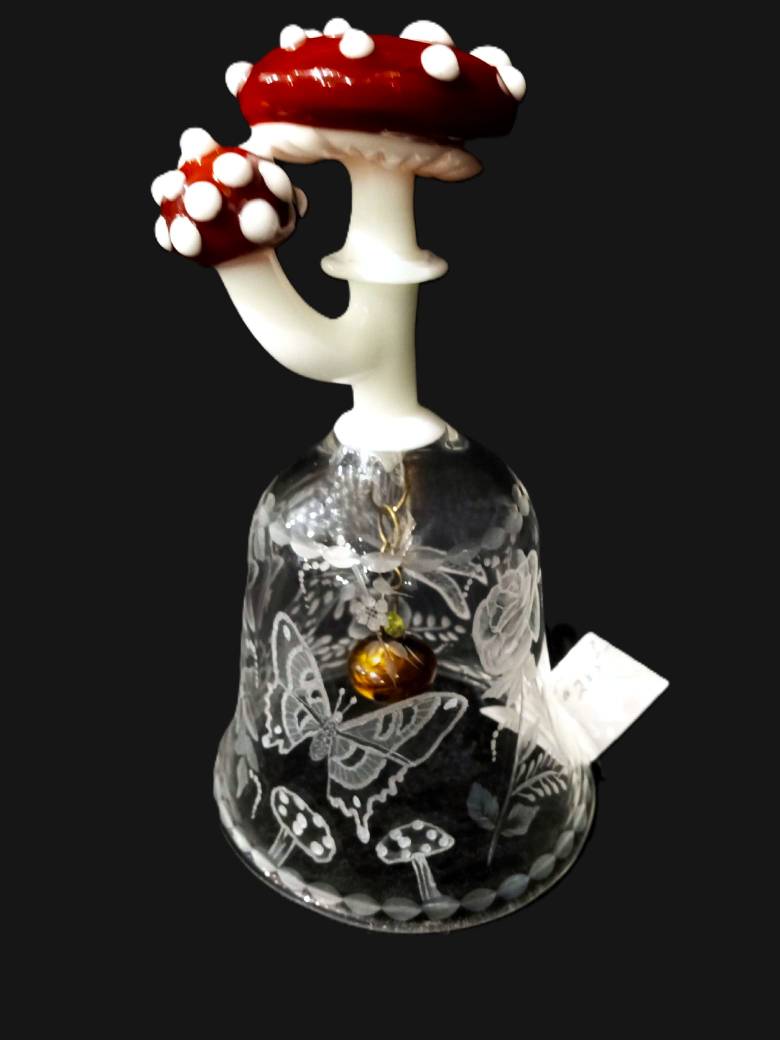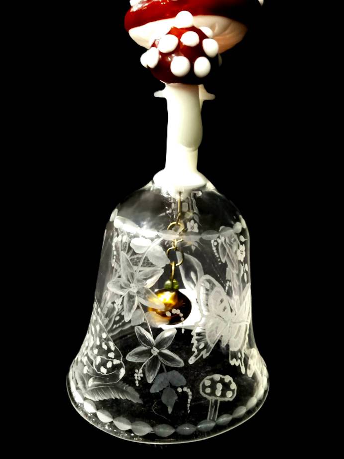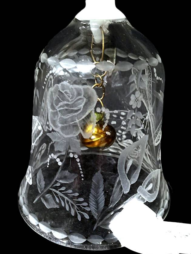This bell has images of a frog, mushrooms, a butterfly, roses and calla lilies and a dragonfly beautifully cut into the glass,. The design is beautifully wrapped perfectly around the bell. The glass Clapper is copper colored and is attached by a thin chain
