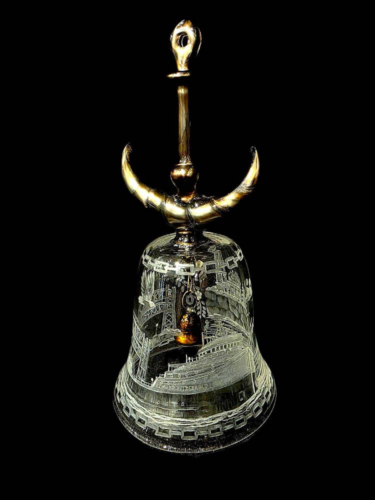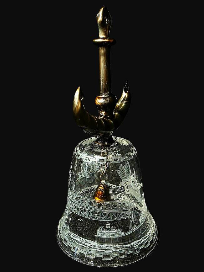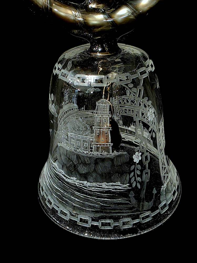 This CLEAR BELL w/ a blown Glass Anchor style handle. This is a glass bell hand-created by Seth Auger & Carl Miller. 2 artists worked together to create this bell. The blown glass bell is handcrafted by local Rochester, Minnesota glass artist Seth Auger, and the beautiful design was hand cut by local glass artist Carl Miller, from Byron, Minnesota.