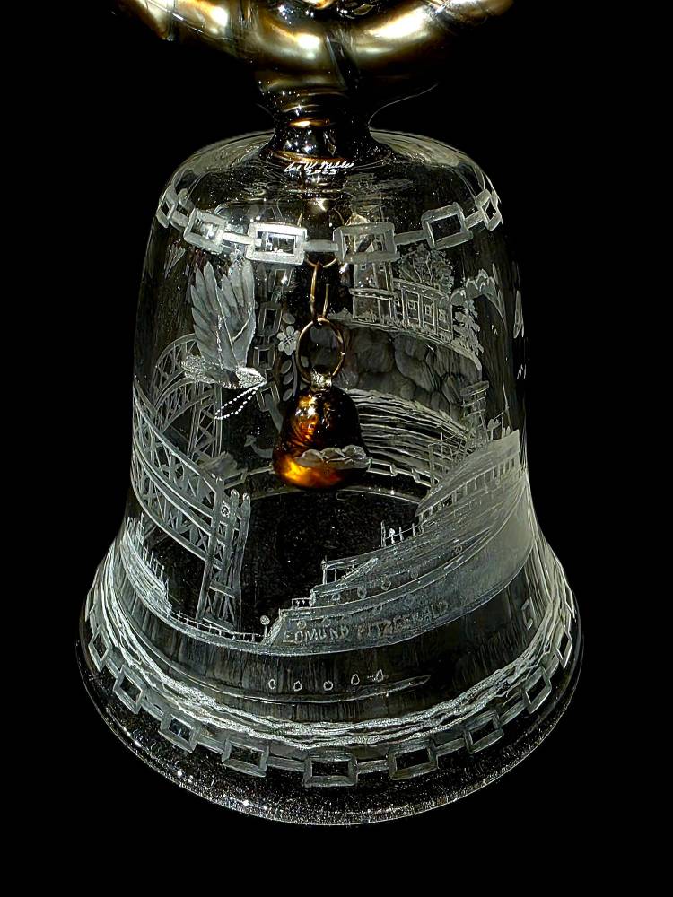 This bell has images of the Edmund Fitzgerald Ship, Split Rock Lighthouse on the open waters of Lake Superior, as well as the Areial Lift Bridge and the eagle soaring carrying 29 pearls in it's mouth to represent each crew member that was lost that night in the storm. The design is beautifully wrapped perfectly around the bell. The glass Clapper is copper colored and is attached by a thin chain