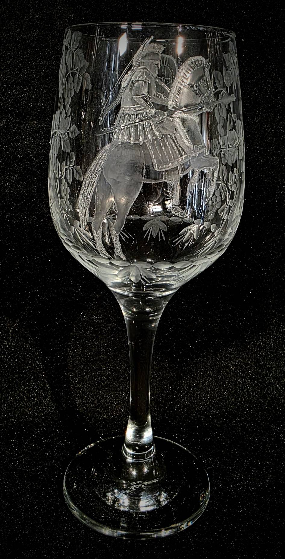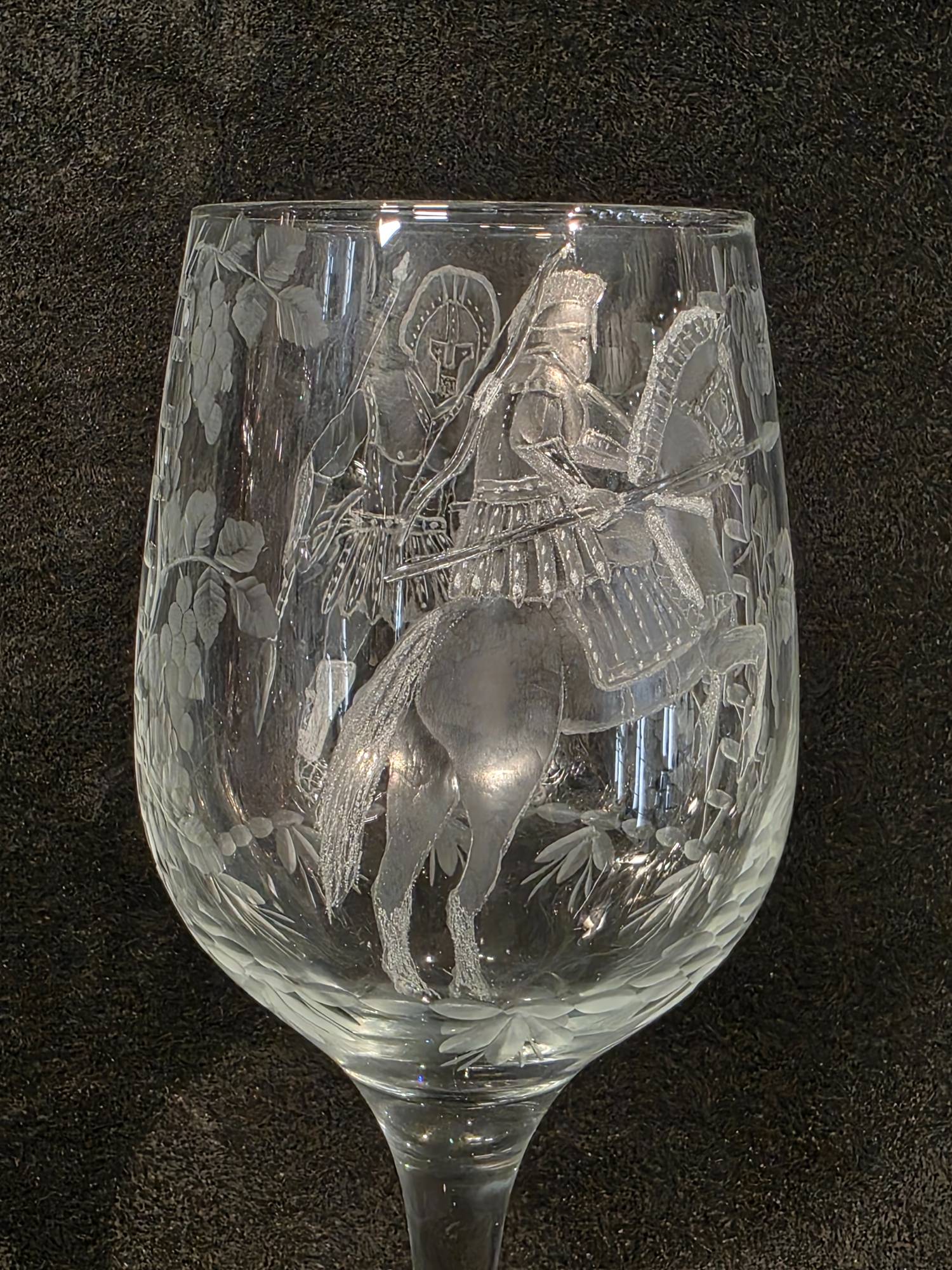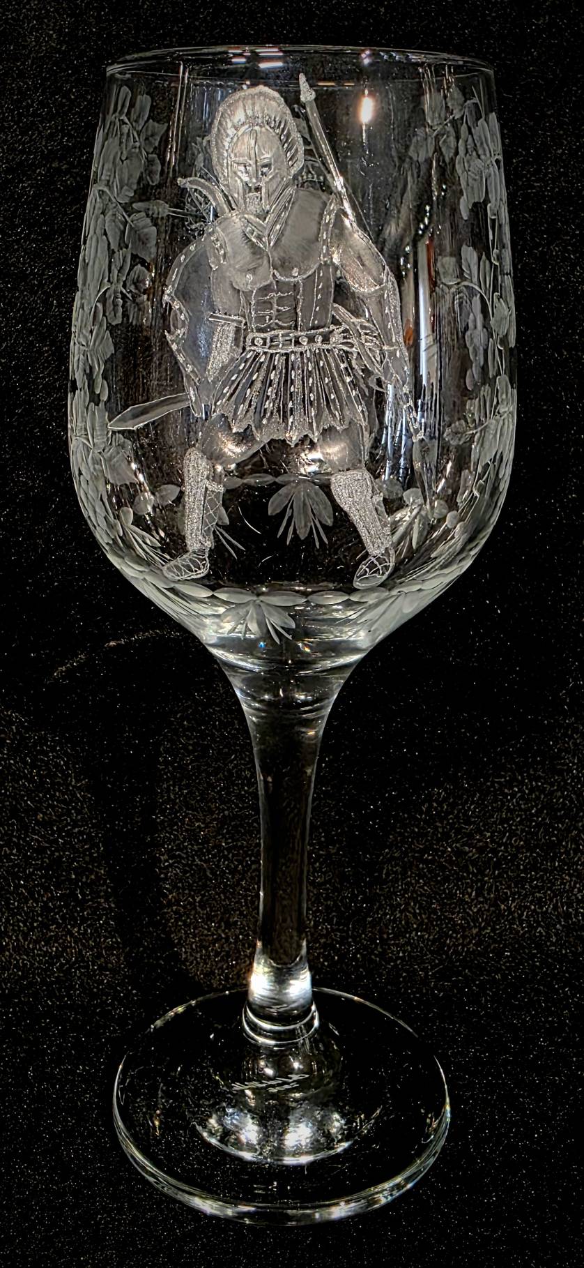 ACHILES AND LEONIDAS WINE GLASS by our very talented cut-glass artist, Carl Miller. Achilles and Leonidas are two of the most famous figures from ancient Greece, but they existed in different eras and their stories blend mythology and history. Achilles is a mythical hero of the Trojan War, while Leonidas was a historical Spartan king who died at the Battle of Thermopylae.