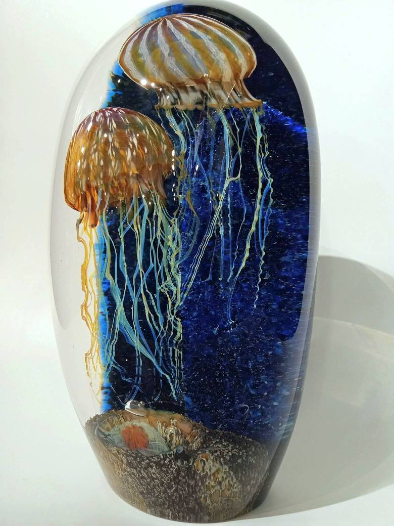 This sculpture is a beautiful depiction of two intertwining Jellyfish over an enchanting sea bottom covered in algae, barnacles and sea anemones.