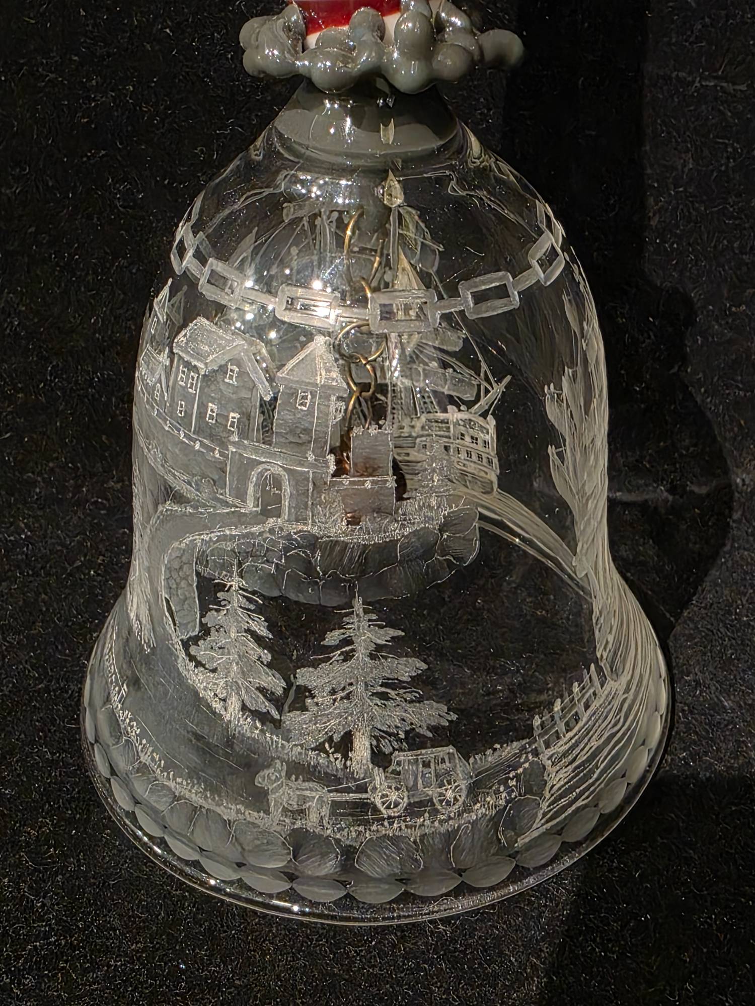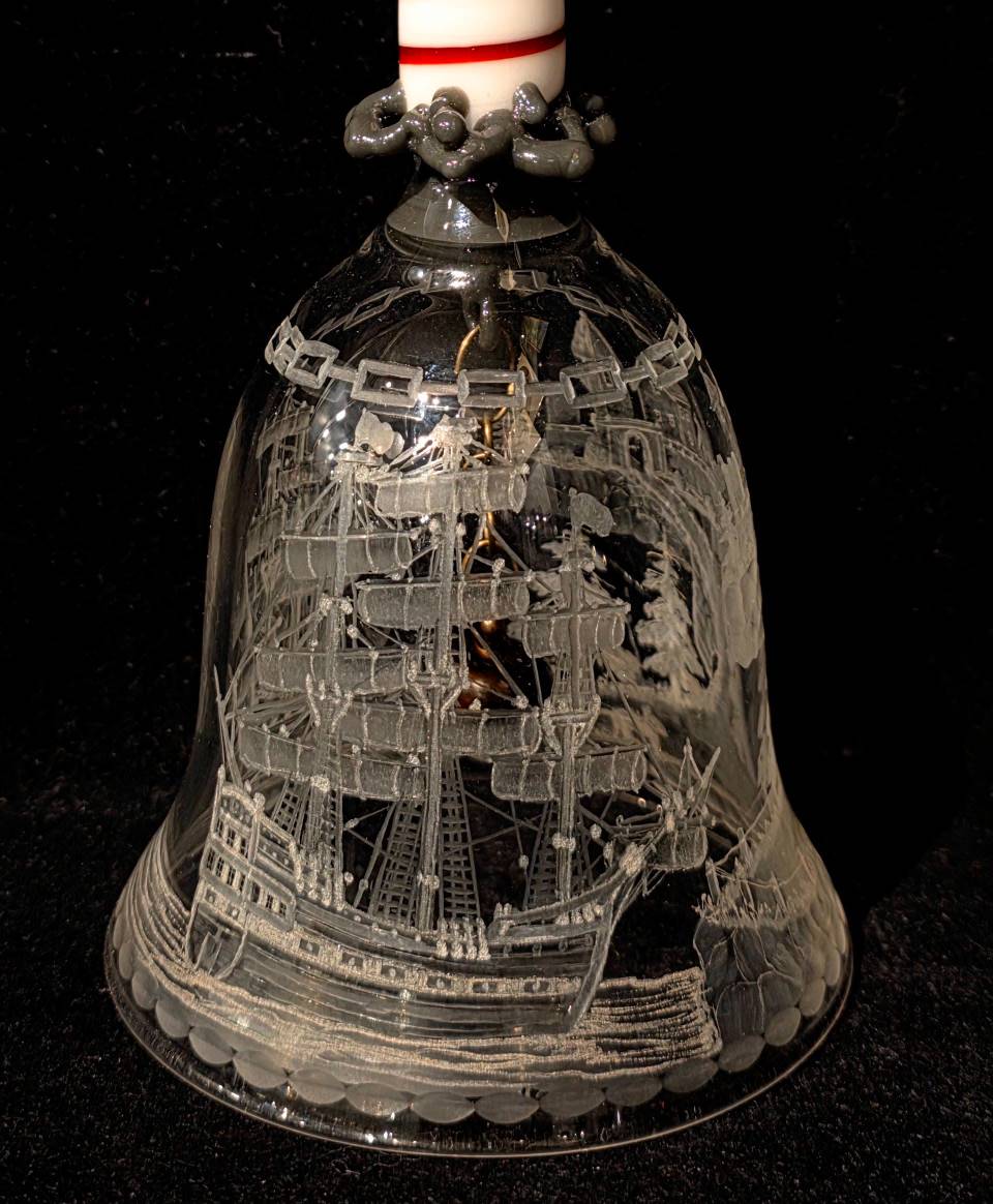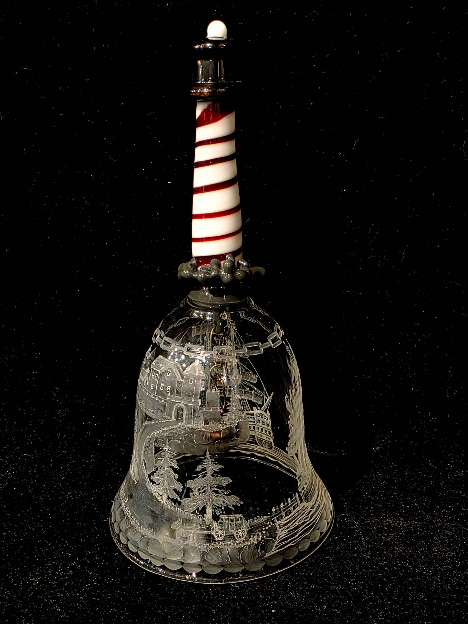 This CLEAR BELL w/ blown lighthouse handle- is a glass bell hand-created by Seth Auger & Carl Miller. 2 artists worked together to create this bell. The blown glass bell is handcrafted by local Rochester, Minnesota glass artist Seth Auger, and the inlet bay with clipper ships was designed and hand cut by local glass artist Carl Miller, from Byron, Minnesota.