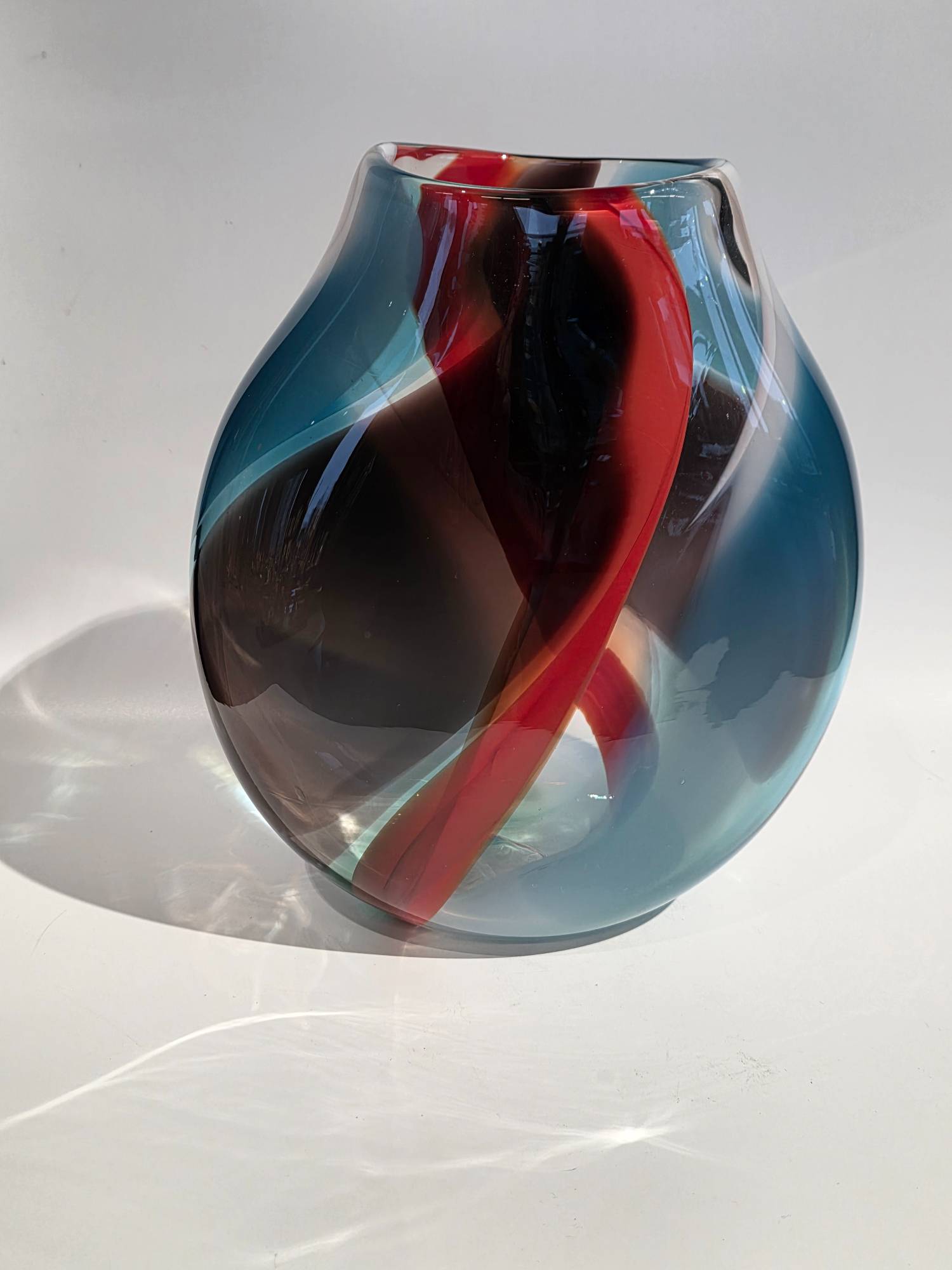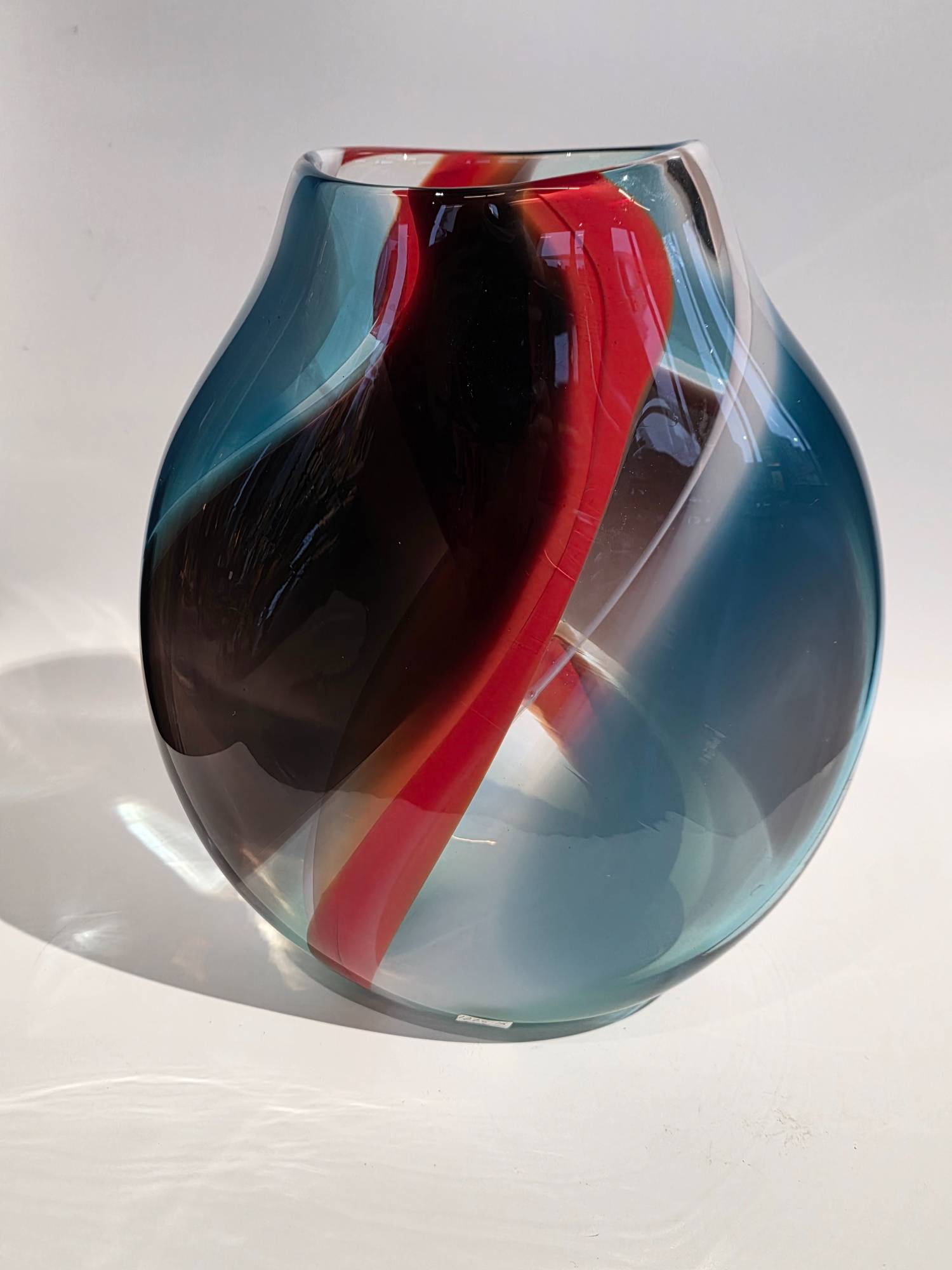 2 Sided Vase Orange Blue White - handcrafted by local Glassblower Robinson Scott, from Anoka, Minnesota.  He has been blowing glass for over 45 years. His stunning artwork has earned him many awards through his glassblowing career. “I am always influenced by the importance of simplistic designs that enhance and accentuate the depth, reflectivity and translucency that naturally occur in glass. The predictability and unpredictability of glass creates an atmosphere of discovery, learning and continual growth. This is what motivates me to further test, expand and explore my abilities.”- Robinson Scott.