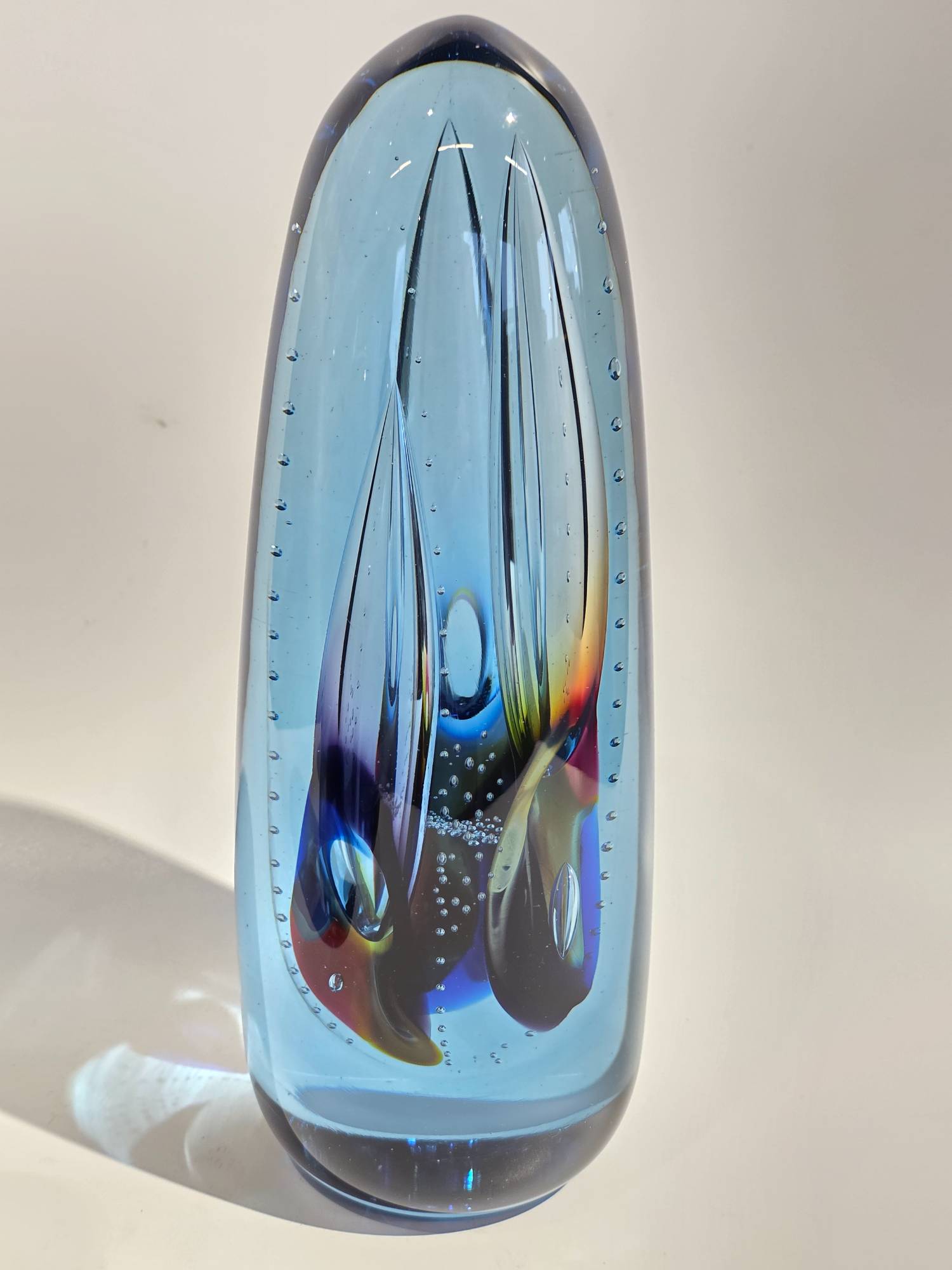 Bullet Shaped Sculpture Blue Green - handcrafted by local Glassblower Robinson Scott, from Anoka, Minnesota. He has been blowing glass for over 45 years. His stunning artwork has earned him many awards through his glassblowing career. “I am always influenced by the importance of simplistic designs that enhance and accentuate the depth, reflectivity and translucency that naturally occur in glass. The predictability and unpredictability of glass creates an atmosphere of discovery, learning and continual growth. This is what motivates me to further test, expand and explore my abilities.”- Robinson Scott.