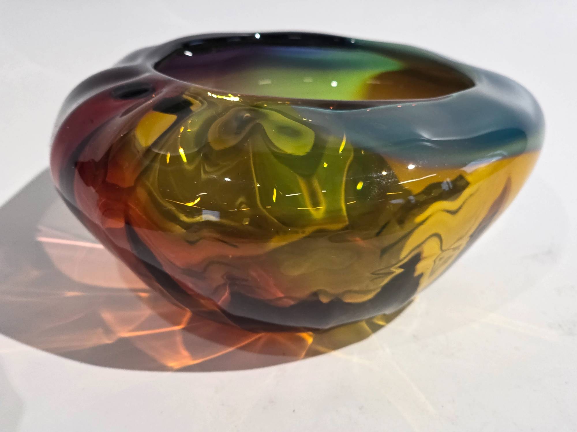 Mini Multi color Optic Bowl - handcrafted by local Glassblower Robinson Scott, from Anoka, Minnesota.  He has been blowing glass for over 45 years. His stunning artwork has earned him many awards through his glassblowing career. “I am always influenced by the importance of simplistic designs that enhance and accentuate the depth, reflectivity and translucency that naturally occur in glass. The predictability and unpredictability of glass creates an atmosphere of discovery, learning and continual growth. This is what motivates me to further test, expand and explore my abilities.”- Robinson Scott.