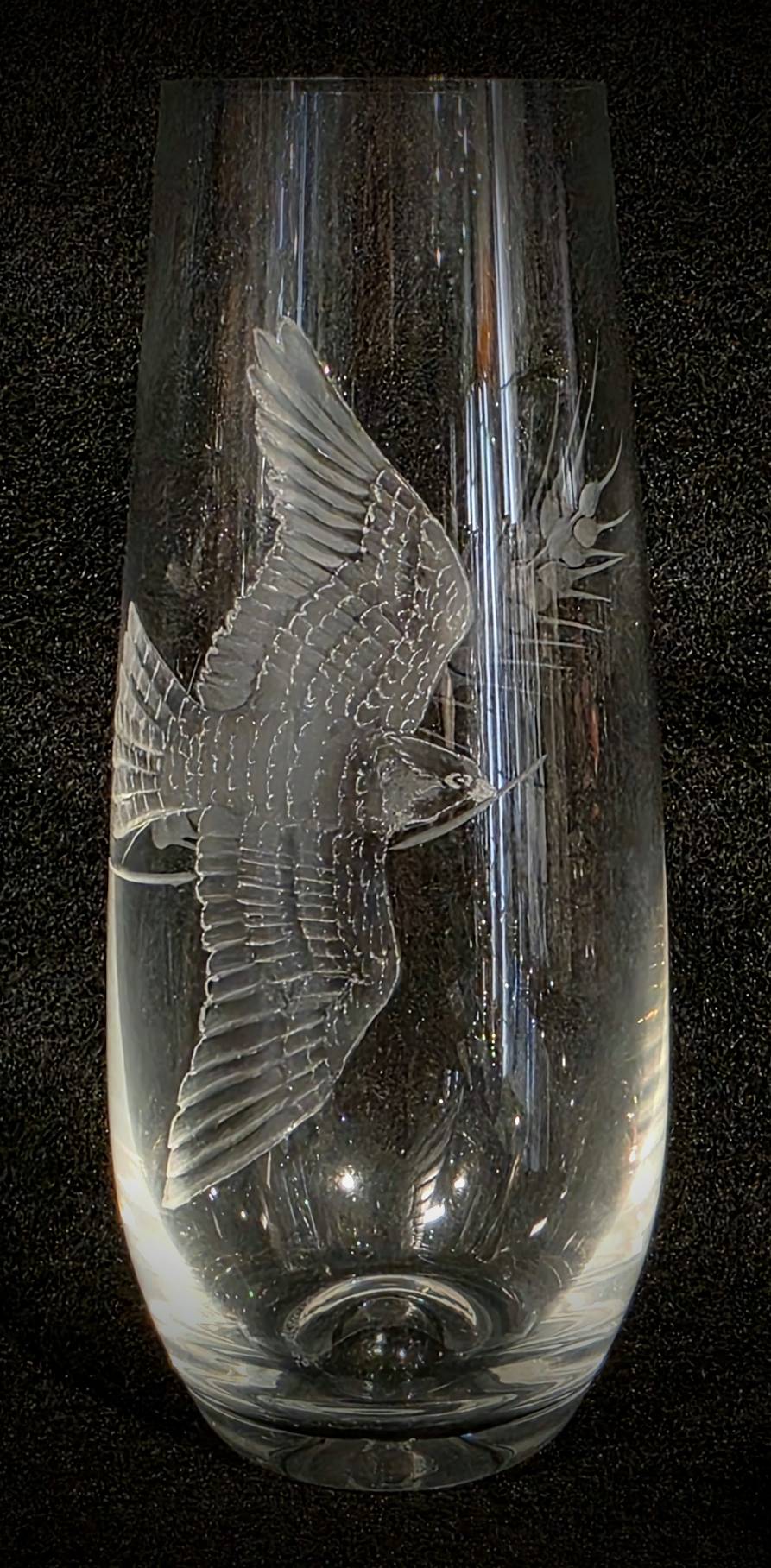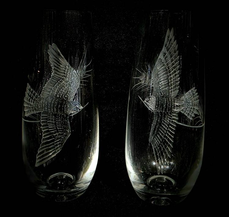 This ONE-OF-A KIND RED STEMLESS CHAMPAGNE FLUTE- PEREGRINE AND WHEAT is done by our very talented local cut-glass artist, Carl Miller.