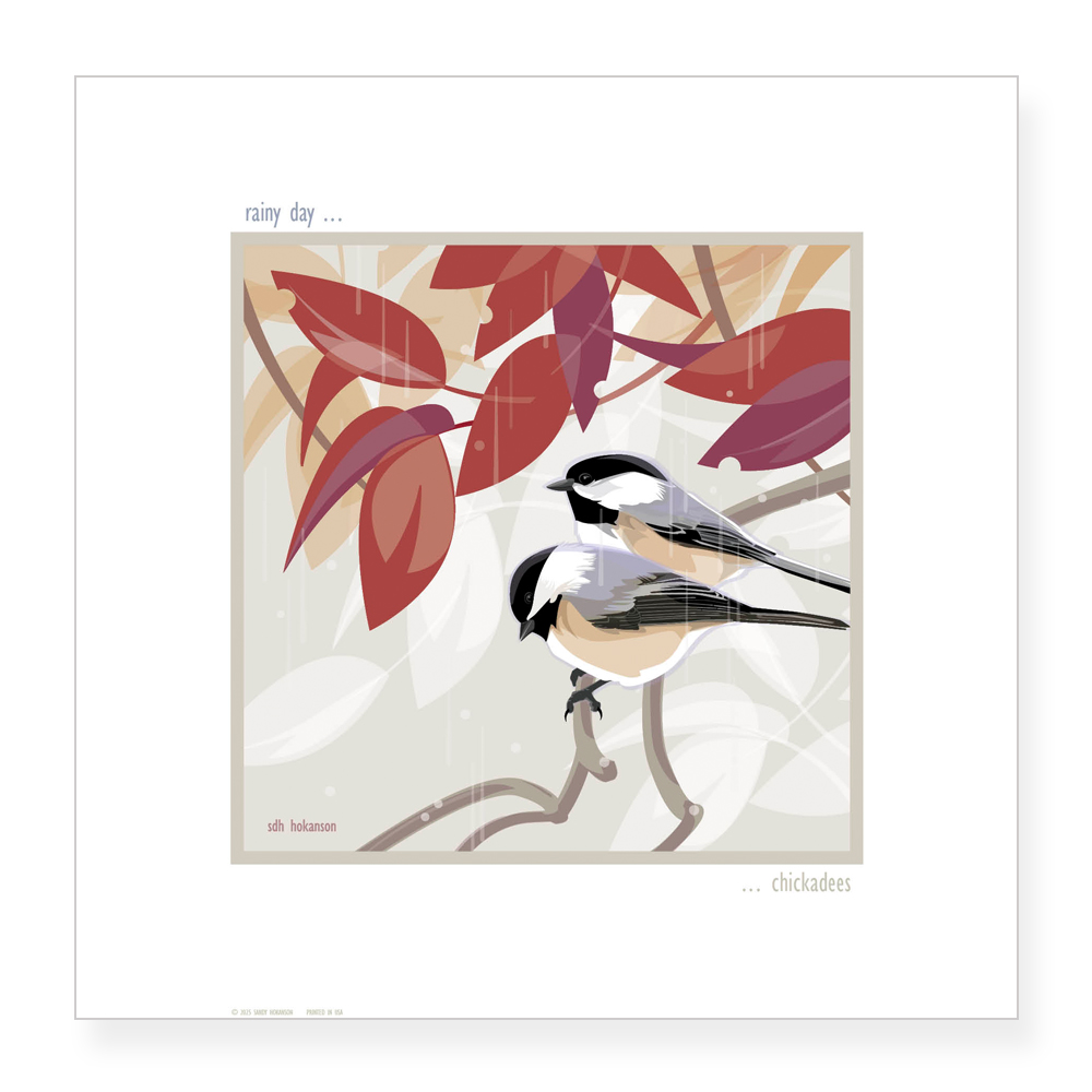 In this original illustration titled "RAINYT DAY - CHICKADEES" by Sandy Hokanson, a pair of chickadees pause while under a canopy of red leaves while the rain gently falls. A simply peaceful moment shared by friends as they wait for the sun to return. This image is available as a note card (blank inside), a signed 12" x 12" shrink-wrapped print, a framed print (black frame) or a 16" x 16" signed metal print.