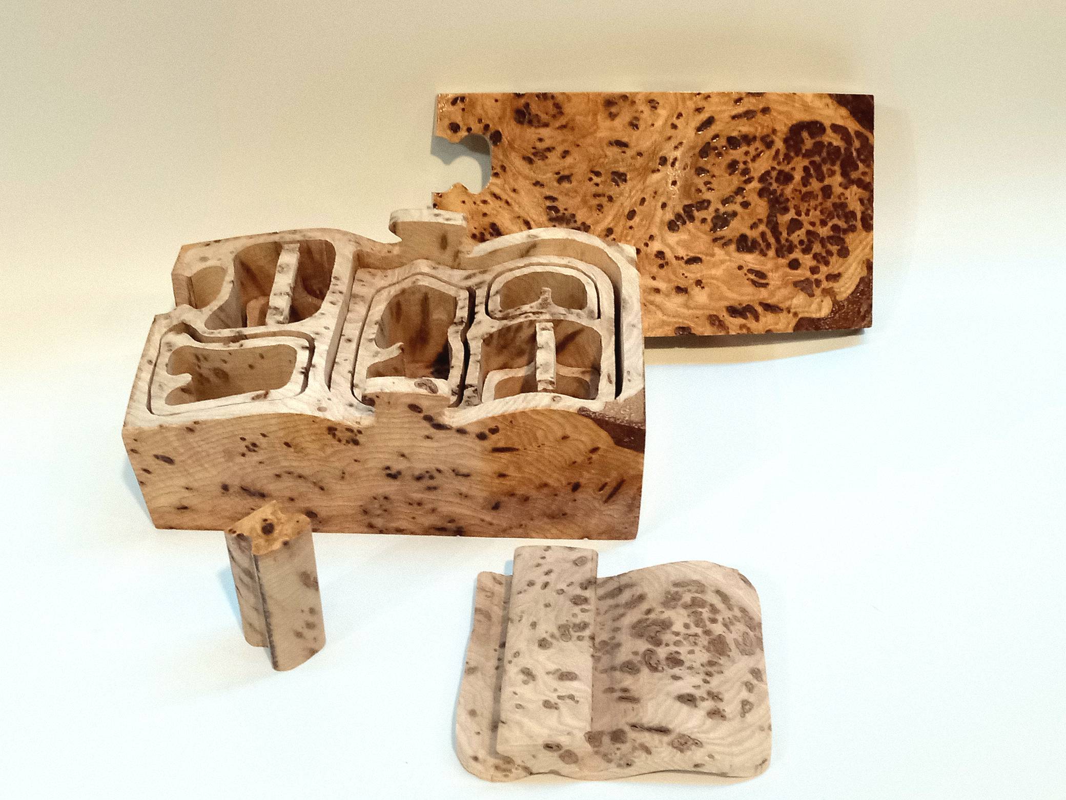 A HICKORY BURL PUZZLE BOXwoodcarving by Harold Rosauer from Manchester Iowa