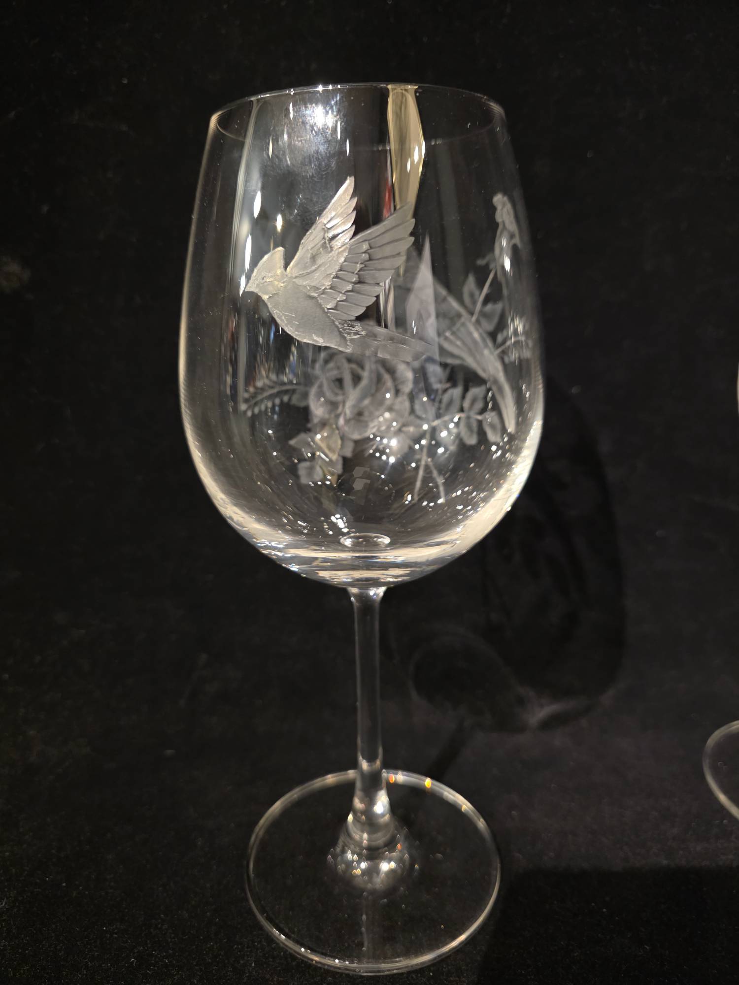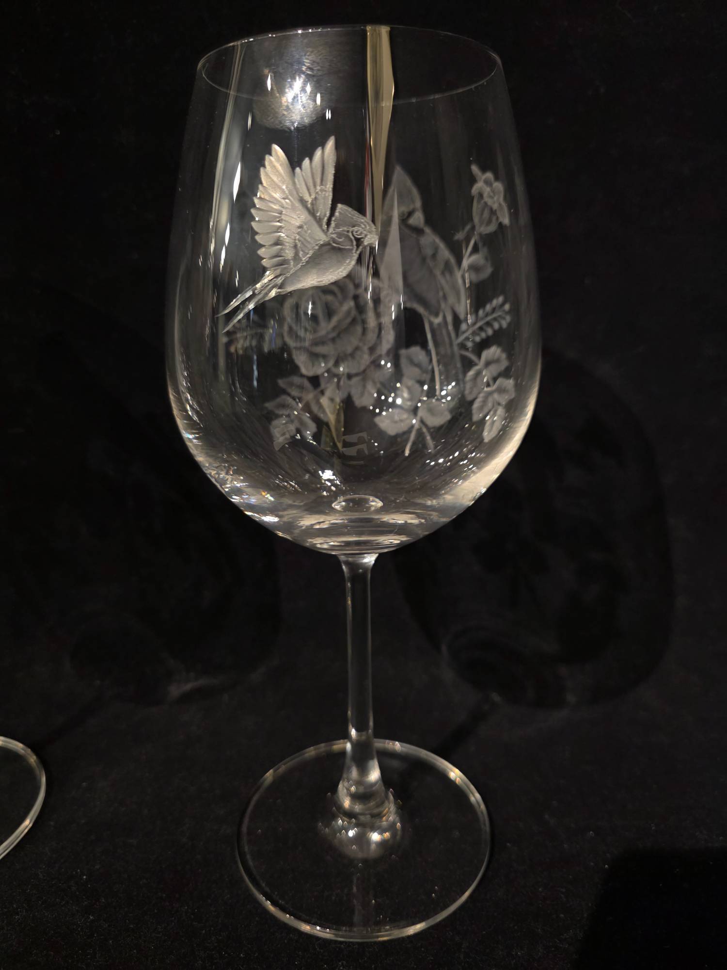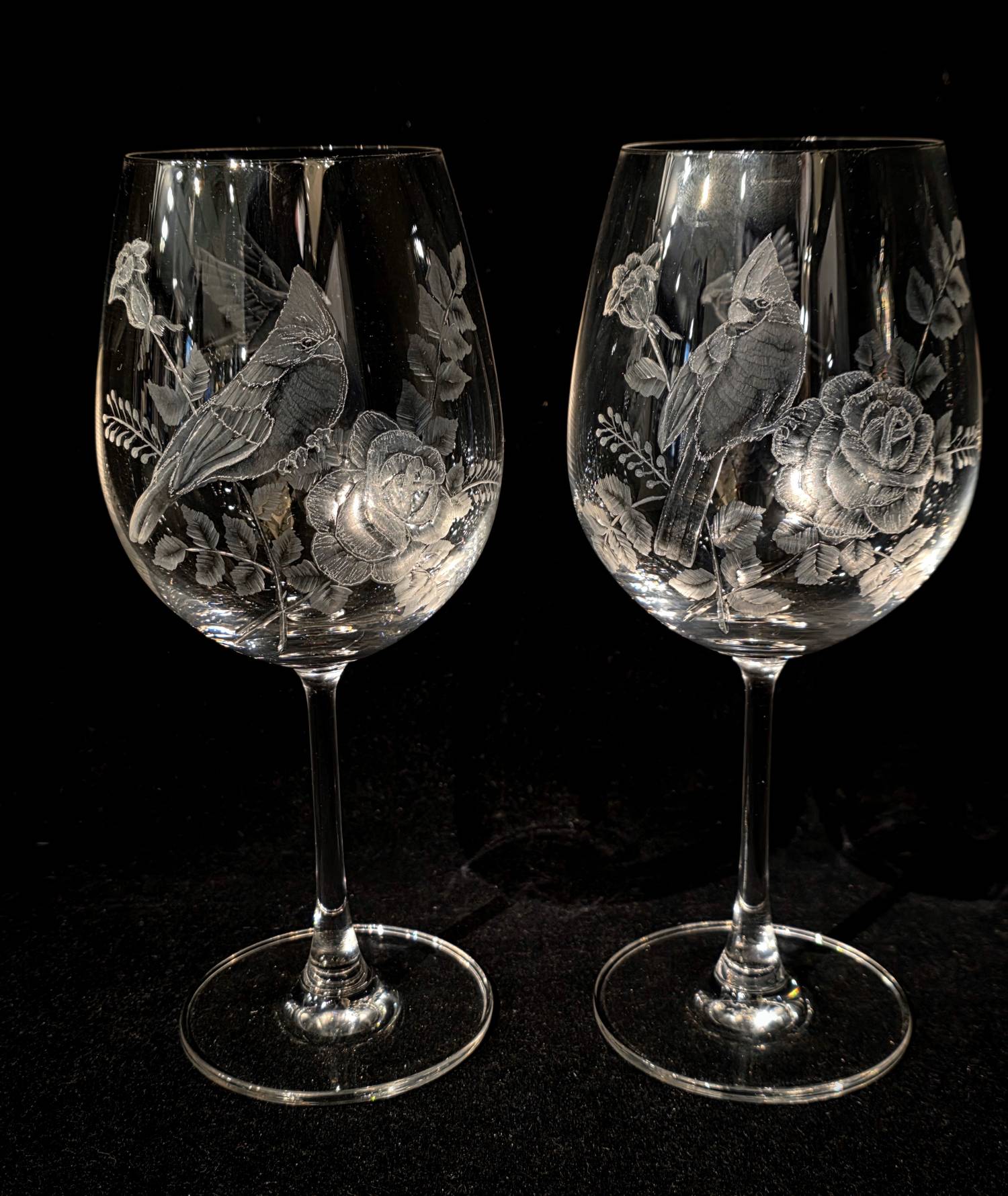 A CARDINAL WINE GLASS SET by our very talented cut-glass artist, Carl Miller. This beautiful glass has detailed cuttings of Cardinals and roses.