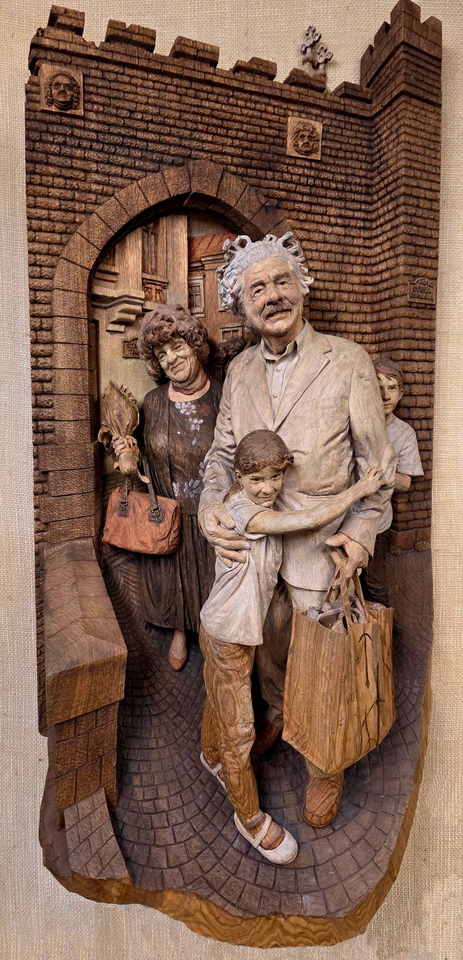 Strada Cornelia, Bucharest - subtitled "Verweile Doch... du bist so schon, "from Goethe's Faust .... Meaning "Linger awhile, you are so beautiful" - (originally said to the moment.) This piece captures an in the moment snapshot of a family on Cornelia street in Bucharest. One of the faces looking out form the city wall is Beethoven representing the Germanic heritage of the city. The church spires behind may be in reference to  Dealul Spirii a hill in Bucharest on which rest the Palace of Parliament, the National Cathedral of Romania and a great Eastern Orthodox Cathedral known as the People's Salvation Cathedral  - Butternut 40.5" h x 19.5" w x 7.5" deep .