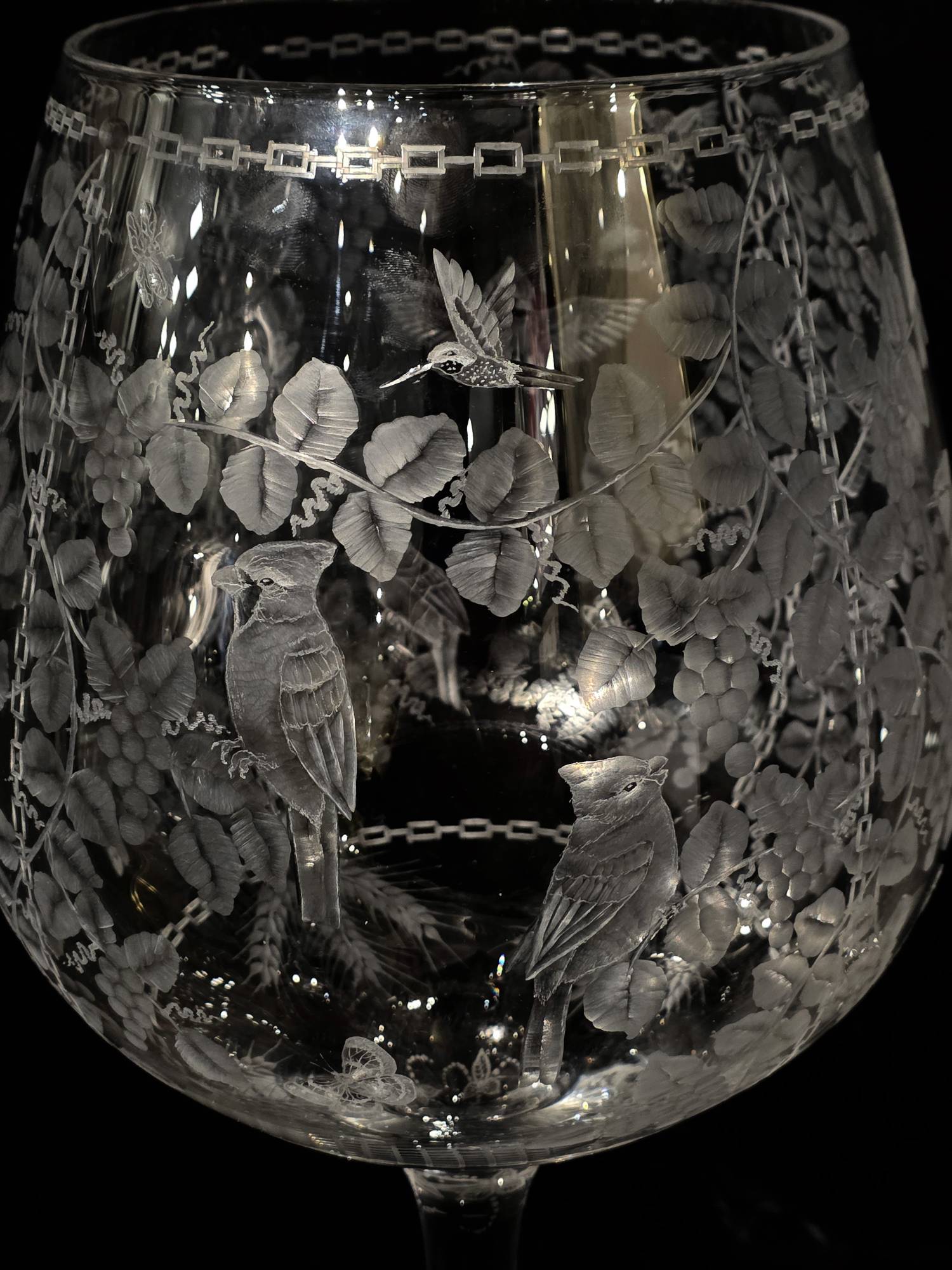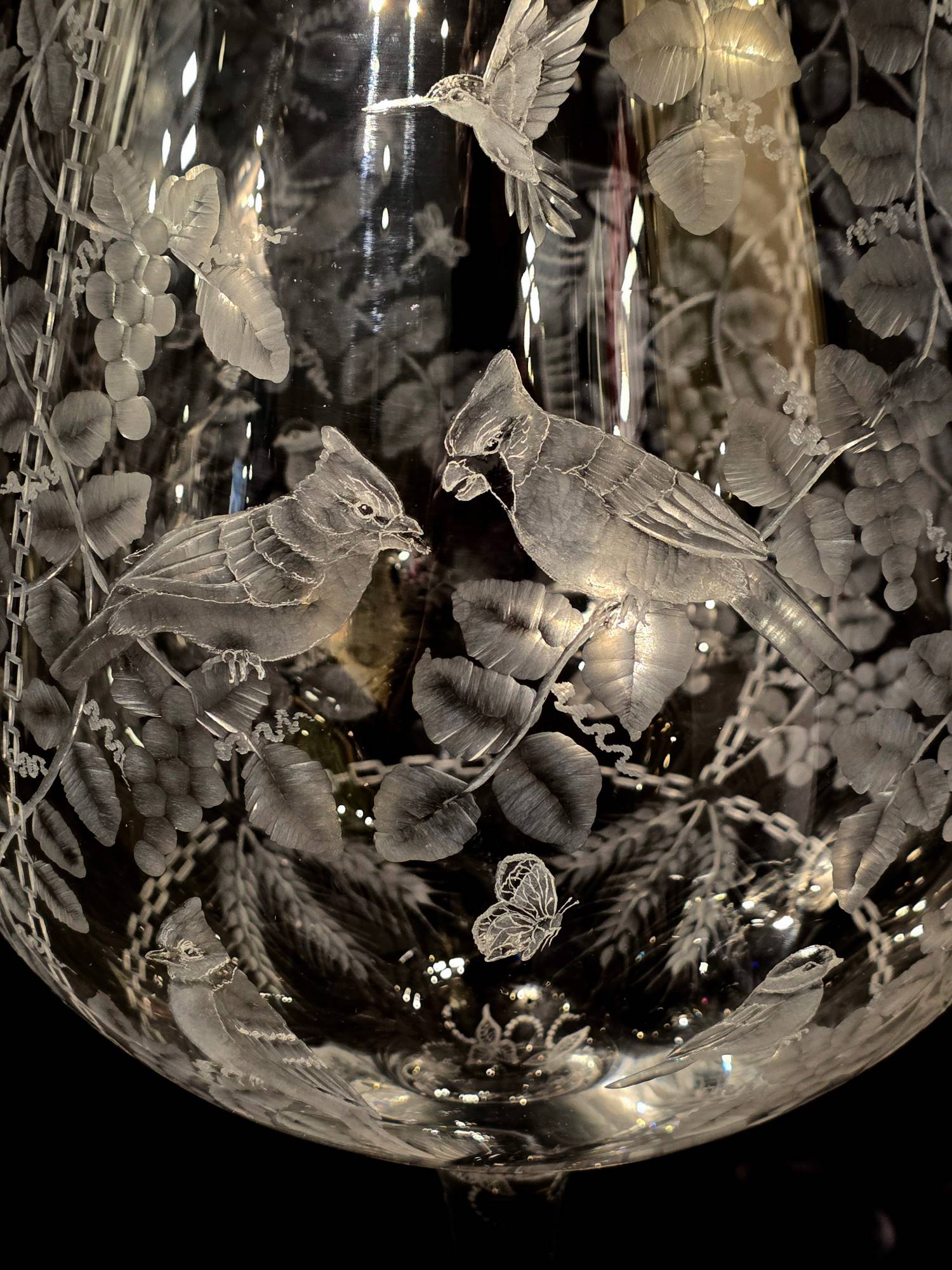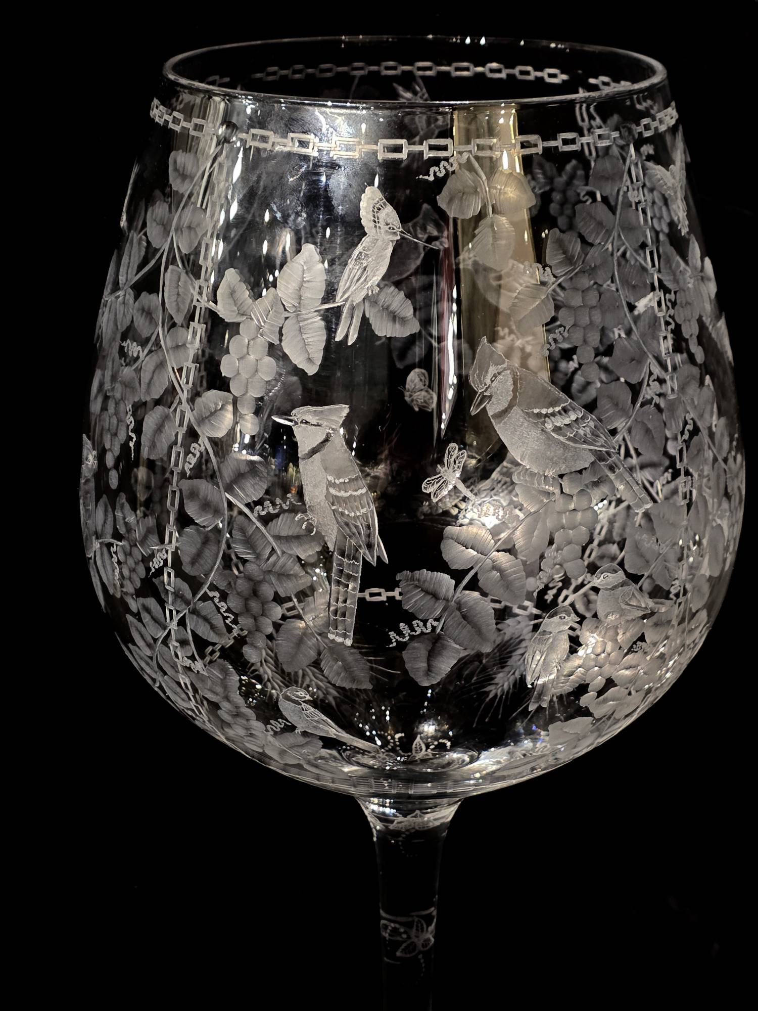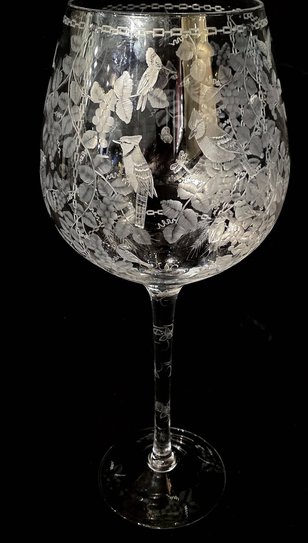 A beautiful, stunning Extra Large/- 2Ft Tall!! Cut Glass "Goblet" (or wine glass) by our very talented cut-glass artist, Carl Miller. This one of a kind piece has beautiful images of Intertwined Grapevines with Cardinals, Blue Jays, Chickadees, Hummingbirds, butterflies, dragonflies,as well as other beautiful designs, including designs cut down the stem- showing the skills of his ability to cut, polish and shade to create a stunning piece.