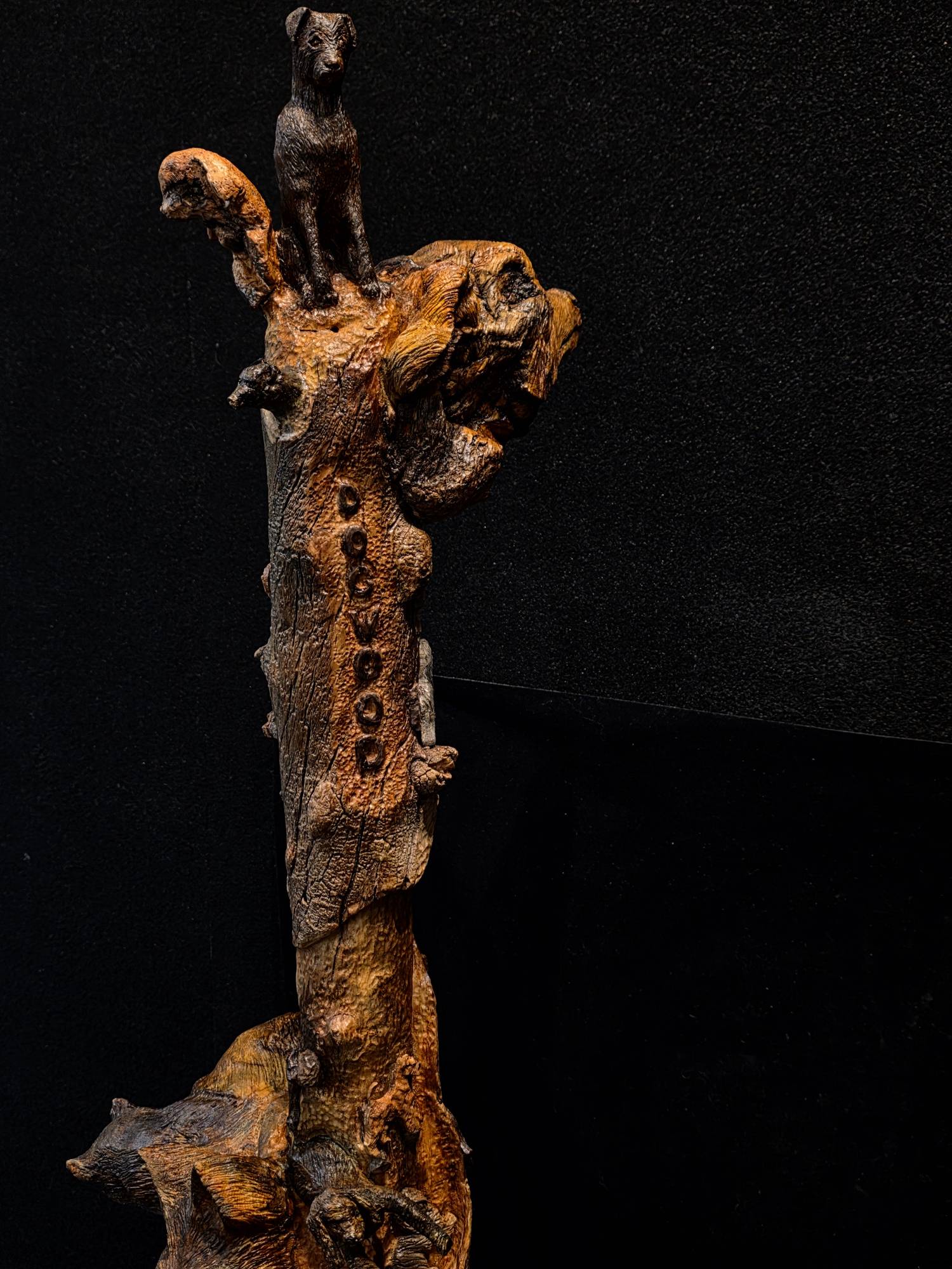 A Lodge Pole Pine story Pole hand carved by Charlie Smalligan -  Adorned with hand carved dogs of all kinds 31" x 18" x 23"