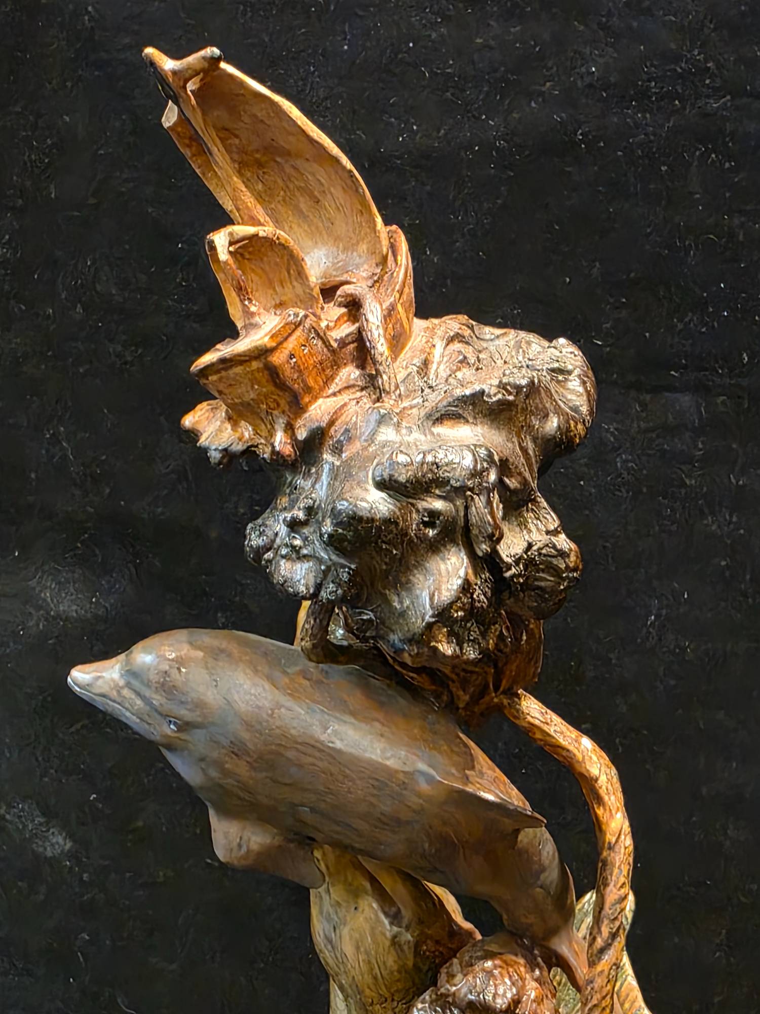 "Cost Analysis" hand carved by Charlie Smalligan from Osage Orange with a Mermaid and Dolphin - Whale ship and imagery relating to harvesting the sea.33" h x 10" x 7"