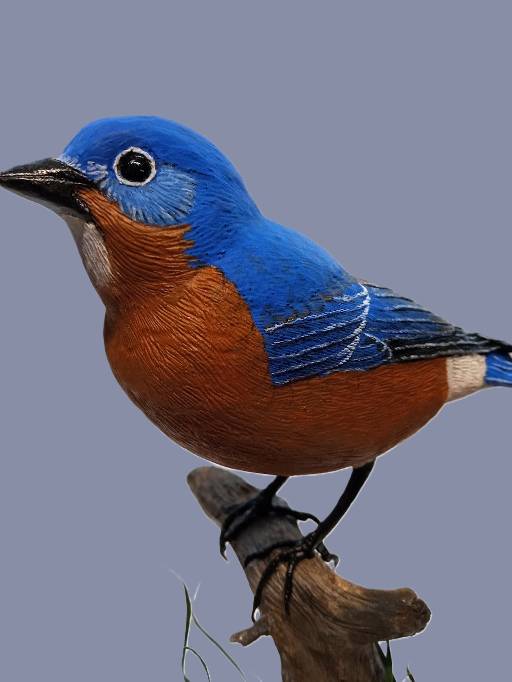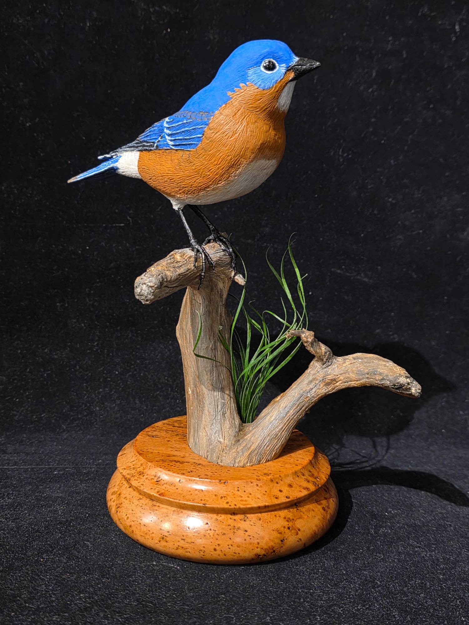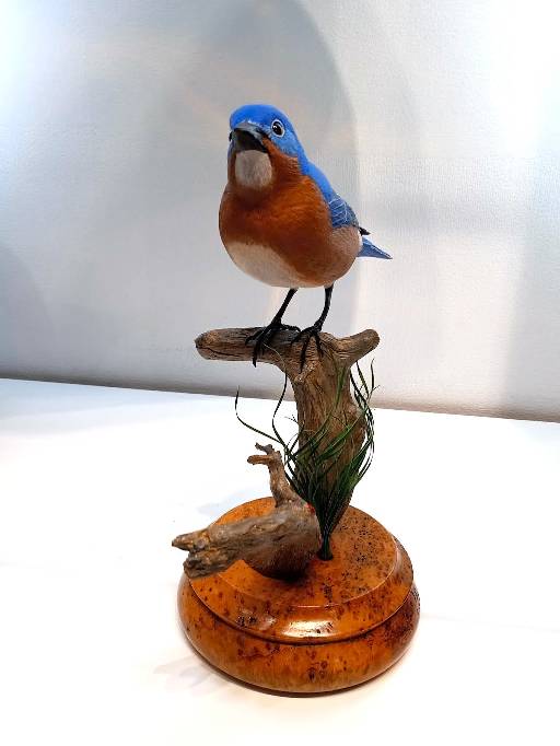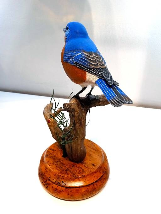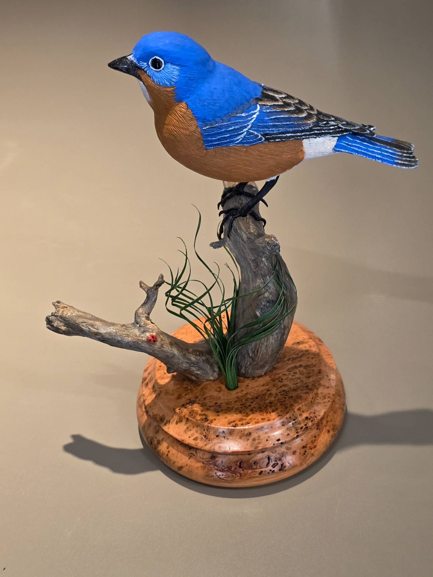 A BLUEBIRD carving by wood carver Harold Rosauer from Iowa. Harold Rosauer has carved 993 lifelike birds, taking up to 900 hours to finish one. He has carved 40,000 wooden bird feather pins, so lifelike you’d think a slight breeze could carry them away.