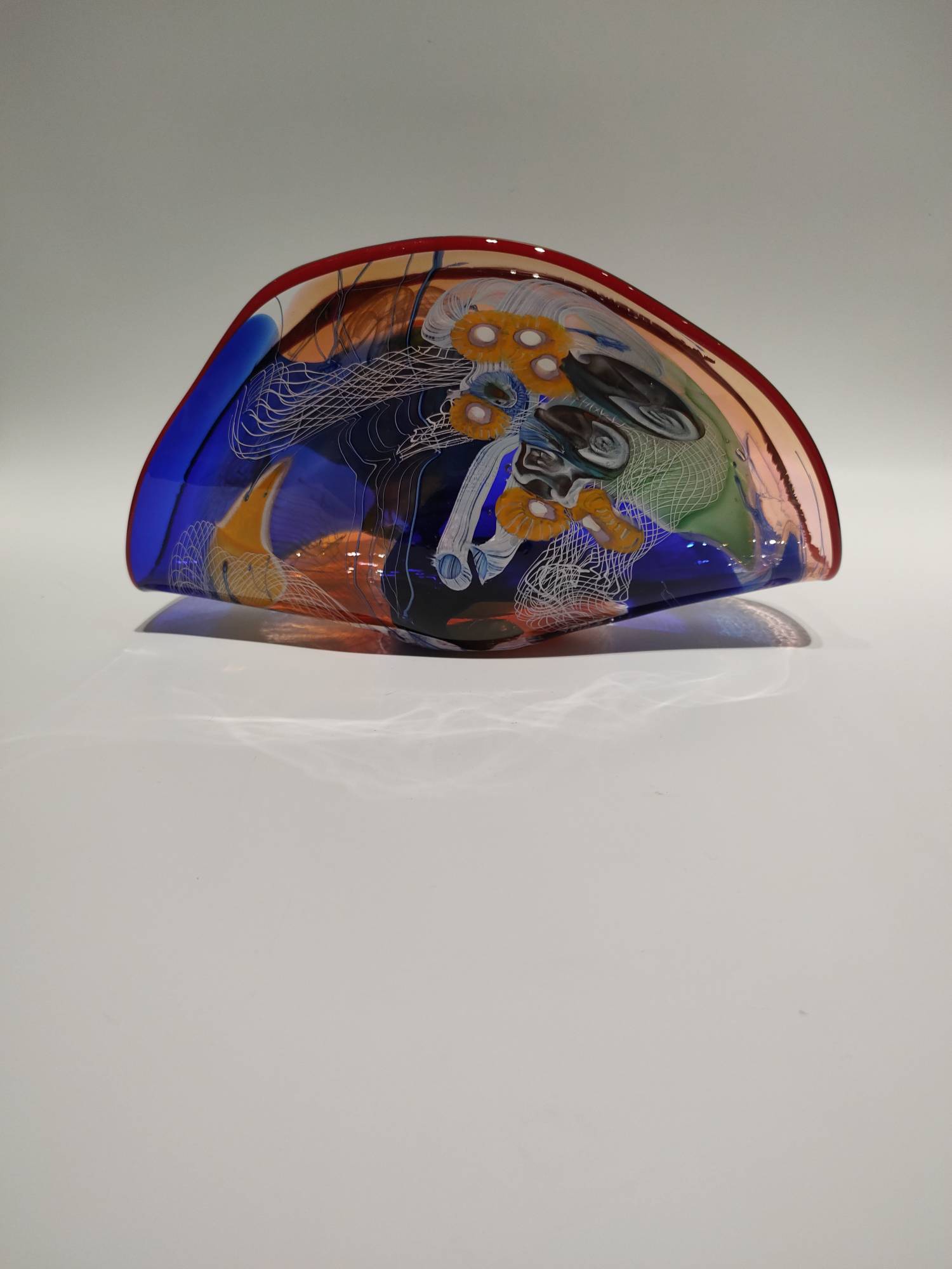 "Wes Hunting has been working with glass for over thirty years. He is known for his incredible skill with cane and murrini as well as remarkably intricate, abstract patterns drawn on hot glass.The vibrant colors and patterns are "drawn" onto the glass surface at temperatures exceeding 2000 degrees. Hunting combines various Italian techniques, such as millefiore and zanfirico, with decorative techniques that he has personally developed and refined. While the forms of his work have changed over the years, they have always remained simple, with the intention that they never distract from the increasing complexities of the surface decoration. Wes Hunting always had an interest in art, but it wasn't until working at a historical village in college that he first tried glassblowing. After graduating from Kent State University in 1976, he studied glass at Penland School of Crafts and worked as an assistant to glass artist Richard Ritter for six months. He later traveled to Italy to take in the glass scene in Venice and Murano. Today, he works as a team with his son, Wesley, in his home studio in rural Wisconsin."-