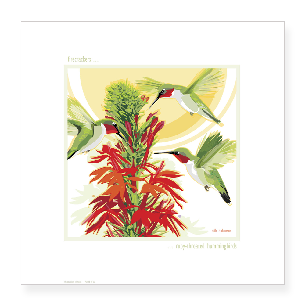 In this original illustration titled "FIRECRACKERS - HUMMINGBIRDS" by Sandy Hokanson, 3 Ruby-throated hummingbirds circle around a brilliant cardinal flower. They look like firecrackers whizzing about the sky in bursts of red and green. This image is available as a note card (blank inside), a signed 12" x 12" shrink-wrapped print, a framed print (black frame) or a 16" x 16" signed metal print.
