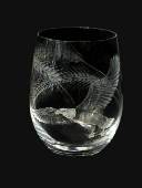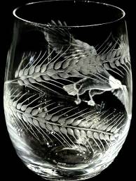 ONE OF A KIND- CUT GLASS PIECE- a beautiful cut glass stemless wine glass with an eagle in flight and wheat plants wrapped around the glass