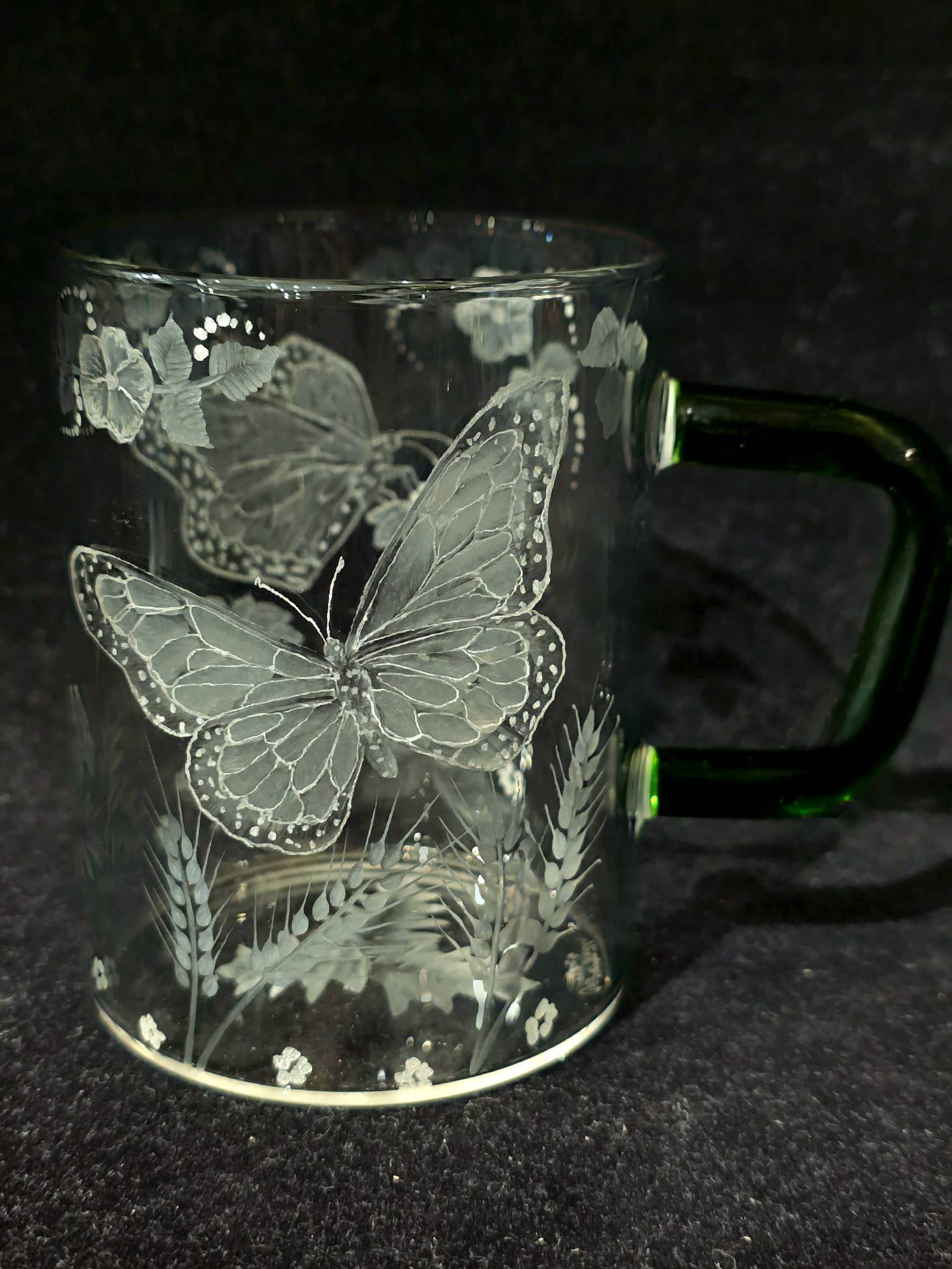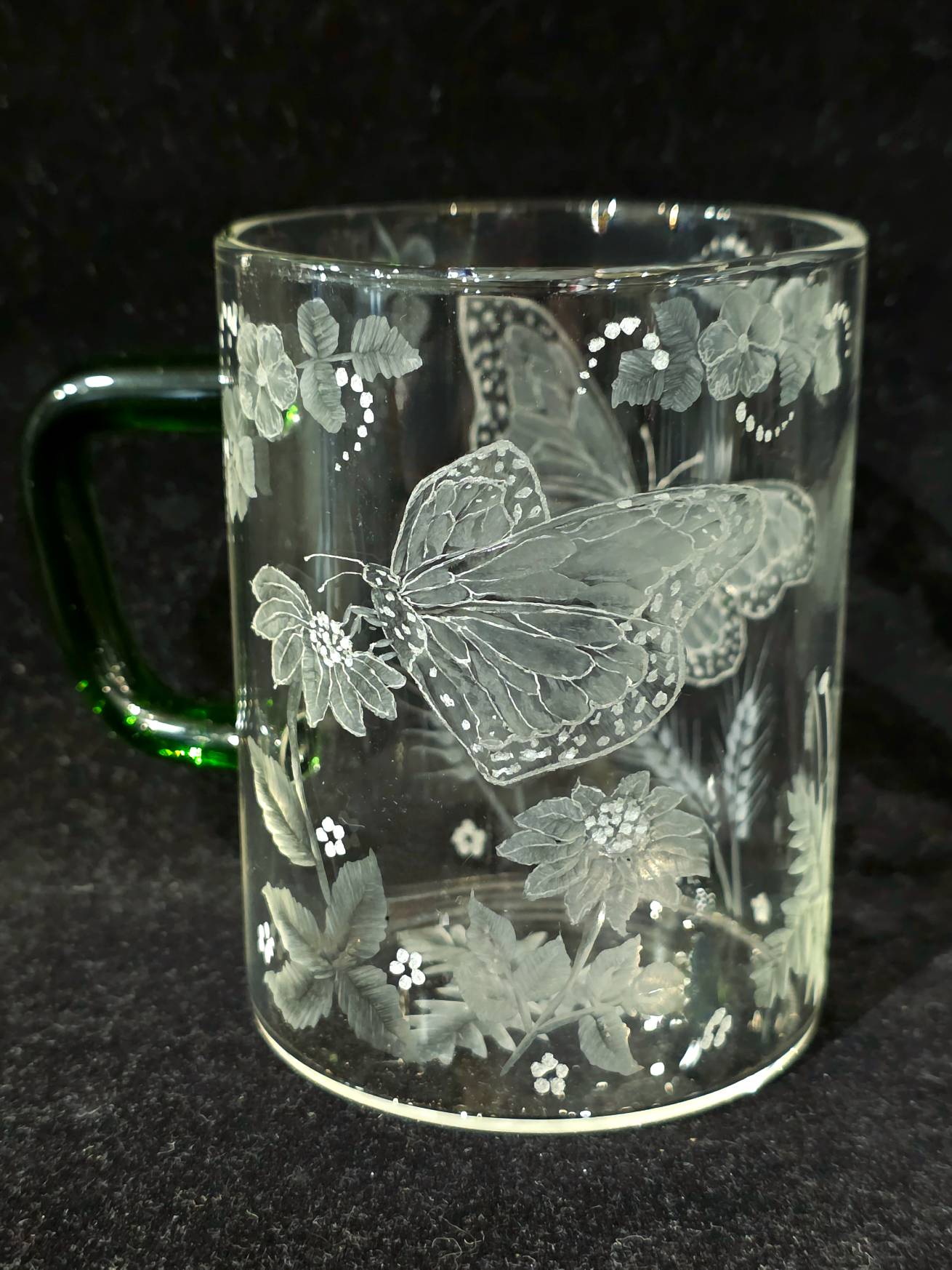 ONE OF A KIND- CUT GLASS PIECE- a unique green-handled glass mug with butterflies and flowers cut into the design of the mug by our local glass cutter Carl Miller.