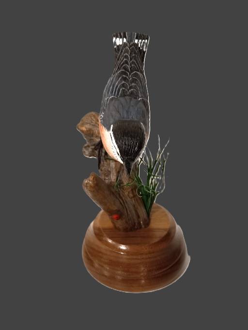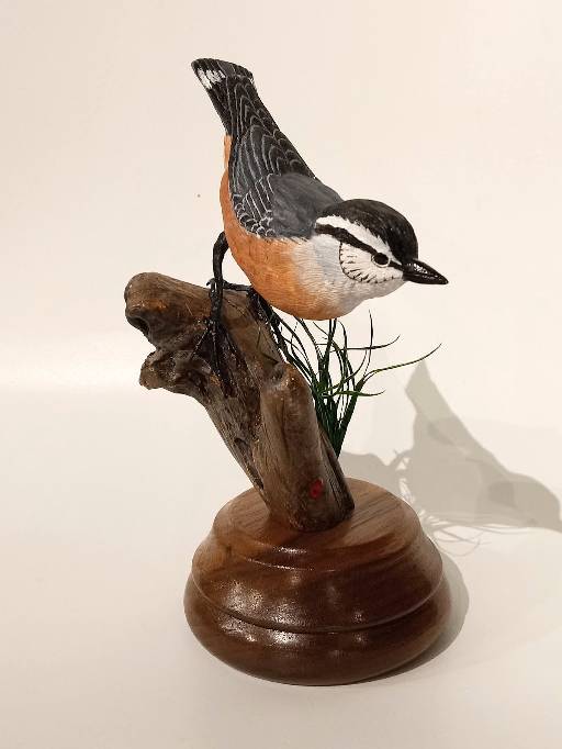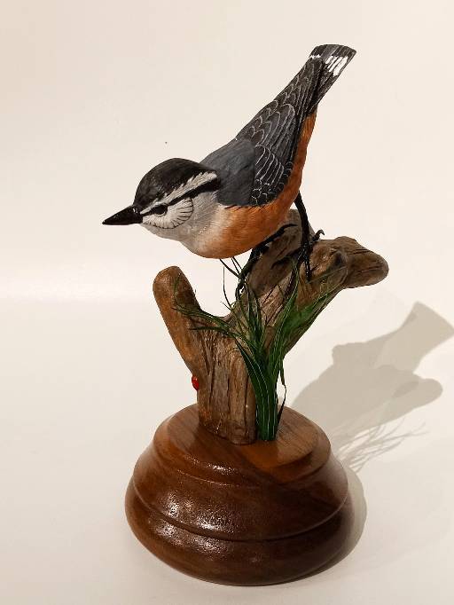 A RED-BREASTED NUTHATCH carving by wood carver Harold Rosauer from Iowa. Harold Rosauer has carved 993 lifelike birds, taking up to 900 hours to finish one. He has carved 40,000 wooden bird feather pins, so lifelike you’d think a slight breeze could carry them away.