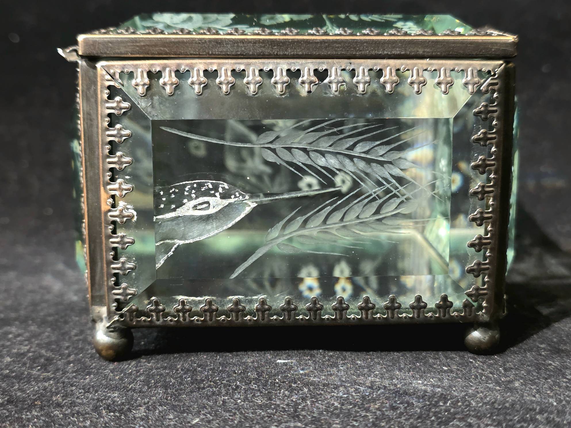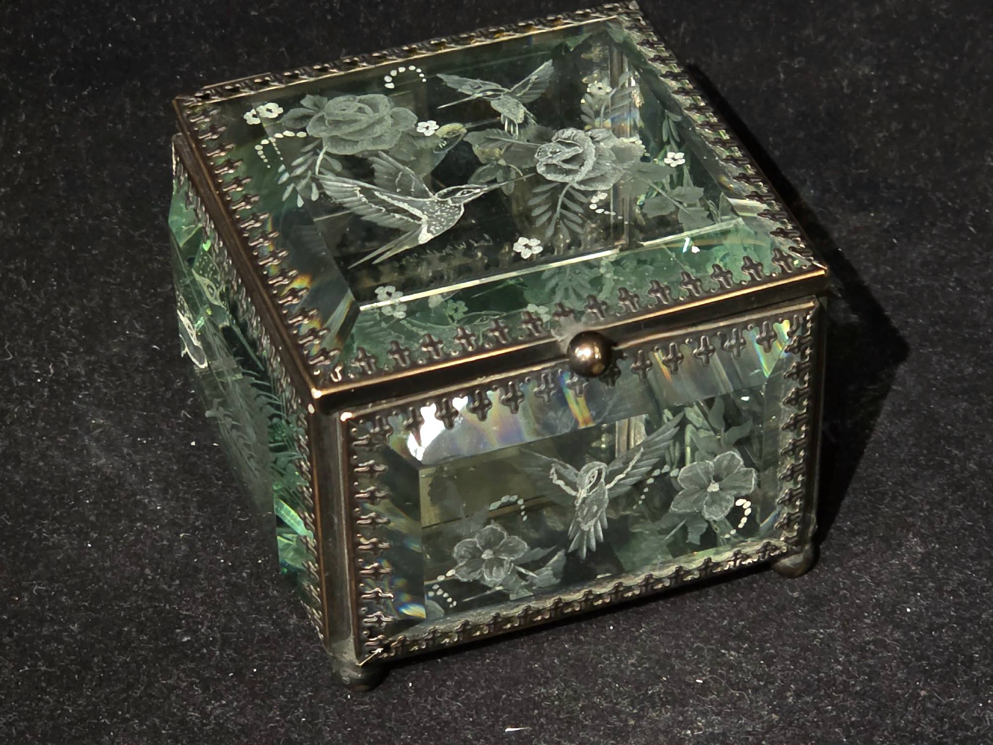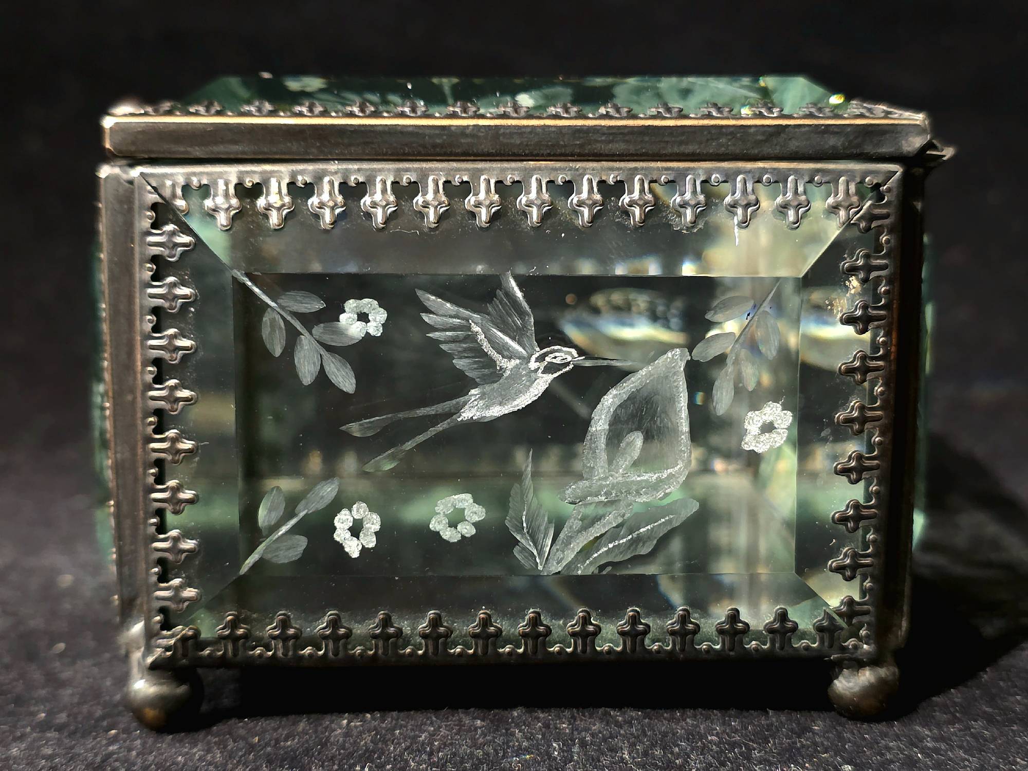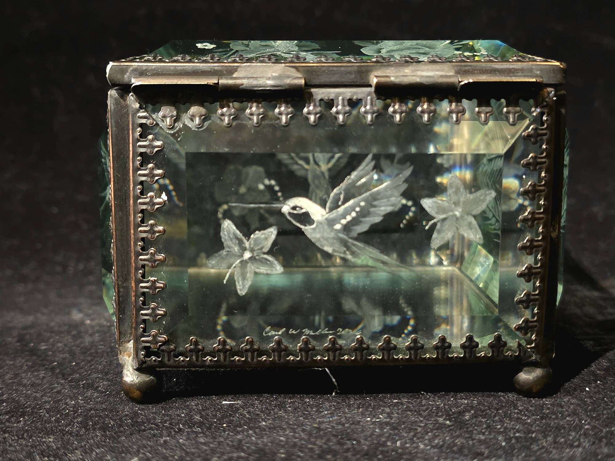 ONE OF A KIND- CUT GLASS PIECE. An amazing Square Mirrored Glass Jewelry Box by our very talented cut-glass artist, Carl Miller. This one-of-a-kind piece has spectacular images of a hummingbirds and roses on the lid, along with a hummingbird and flowers including flowers such as roses and a calla lily on every side (including designs cut on both sides of the lid for that added depth) - showing the skills of his ability to cut, polish and shade to create a stunning piece. This beautiful small, hinged, mirrored glass box (with a swirling knob) is a square shape made with clear glass panels with faceted front sides. Plus, it has a mirrored interior base and a silver-metal trim accenting the edges for a stunning, beautiful finish.