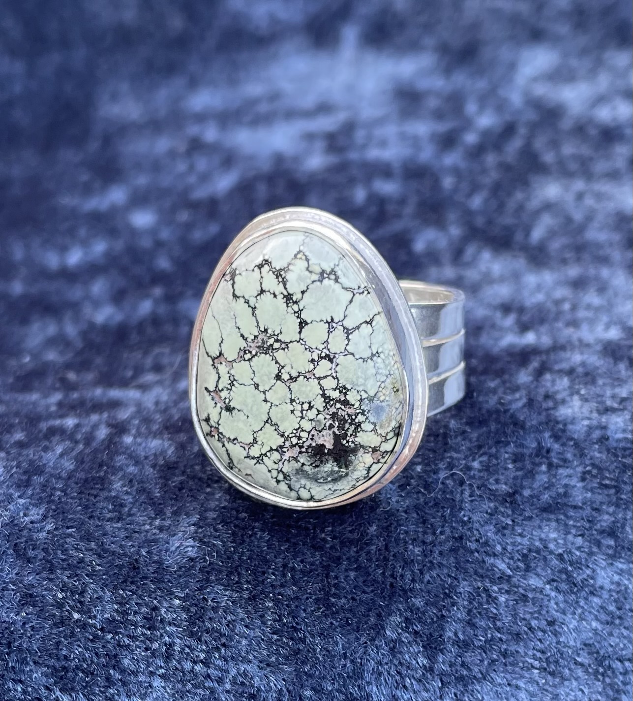 Damele Turquoise is a rare highly collectible American turquoise from a small mine near Austin, Nevada. The cabachon in this ring was purchased from one of the mine owners several years ago. This turquoise is renowned for its hardness, its color, and fine black spiderweb matrix. The ring shank is sterling silver and is sized at 8 1/4.