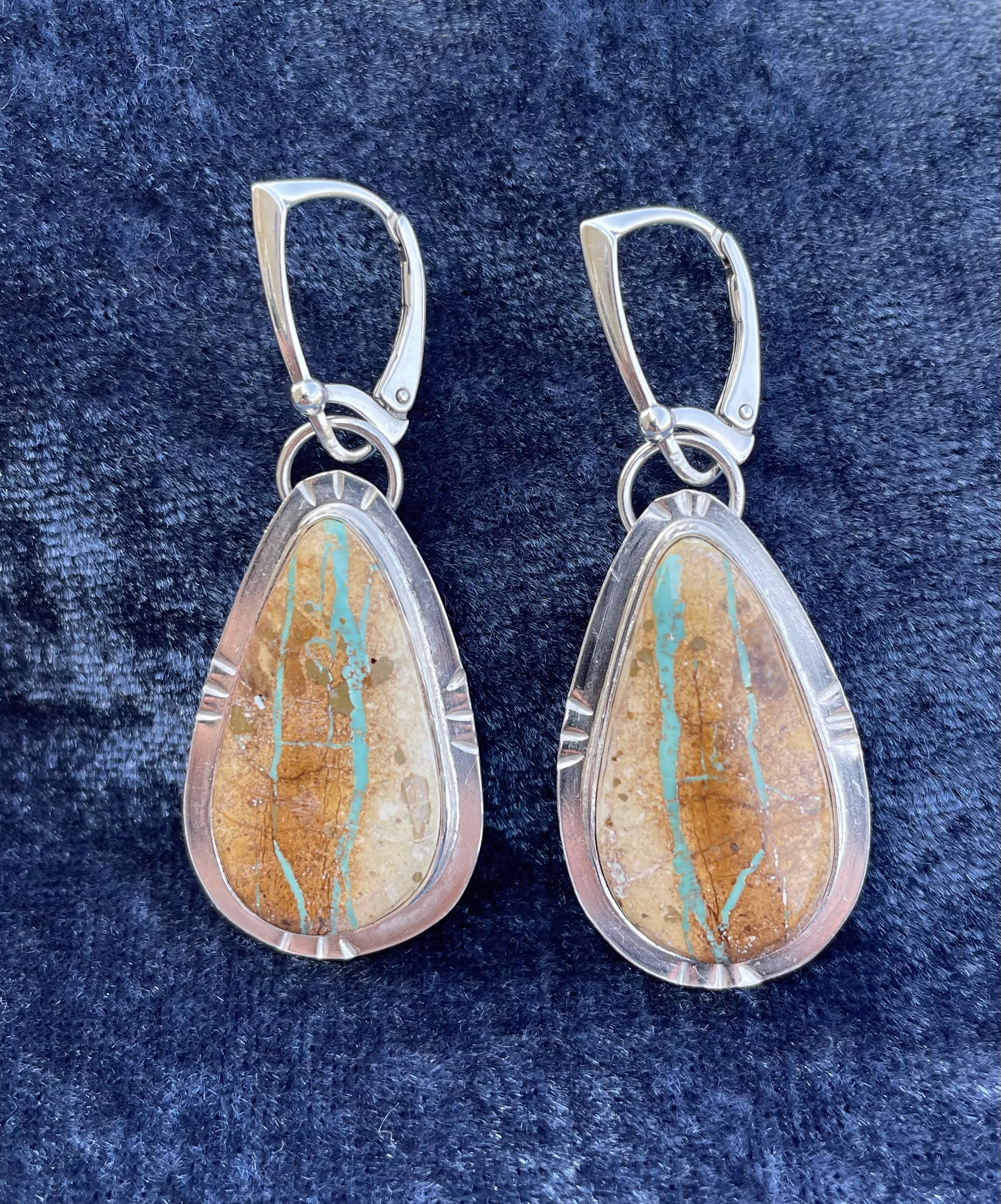 This ribbon turquoise is from the Royston Mine located near Tonopah, Nevada. They are set in sterling silver with sterling silver leverbacks.